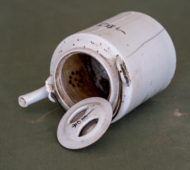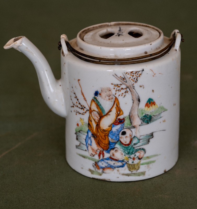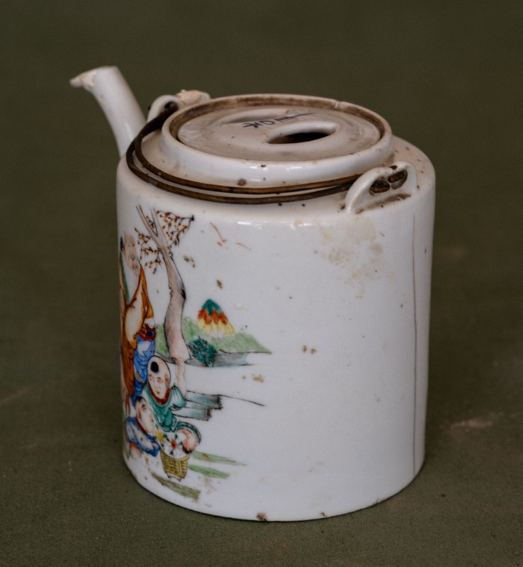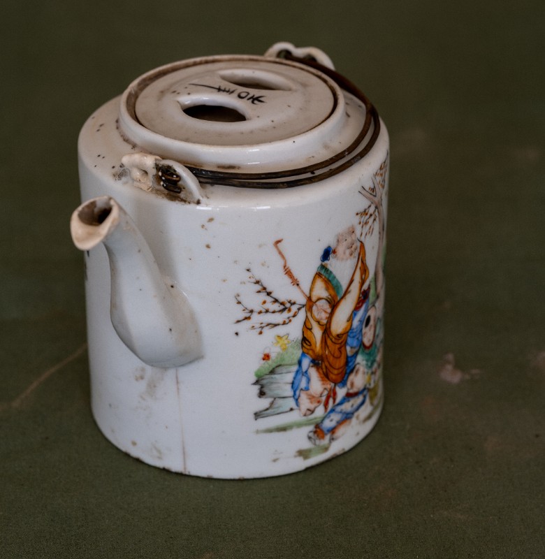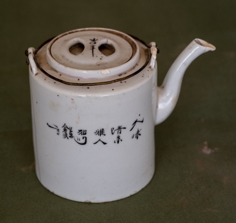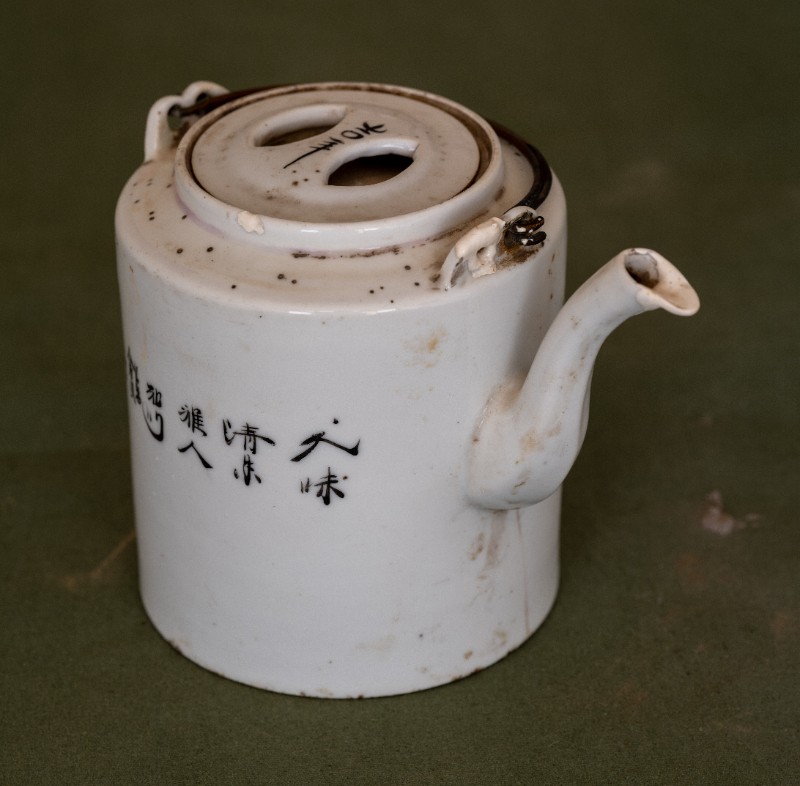民国时期,八路军骑兵团驻扎在桃力民地区时使用过的白瓷印花茶壶,材质为白瓷。民间征集、器型较完整。现存于桃力民抗日革命根据地旧址集群绥蒙工委复原院落。