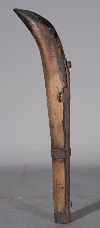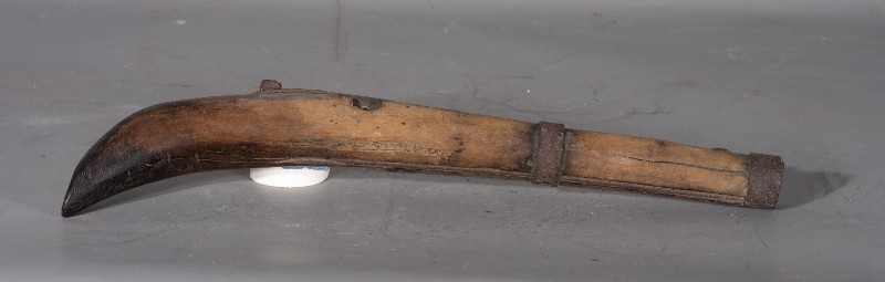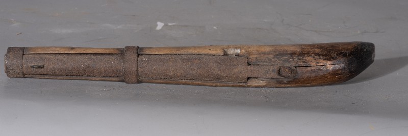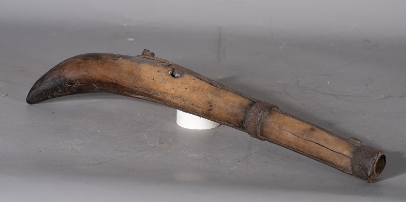 抗日战争时期,桃力民抗日自卫军在桃力民地区自制的火枪,材质为木、铁,木柄有裂纹。现存于桃力民抗日根据地史实陈列馆。