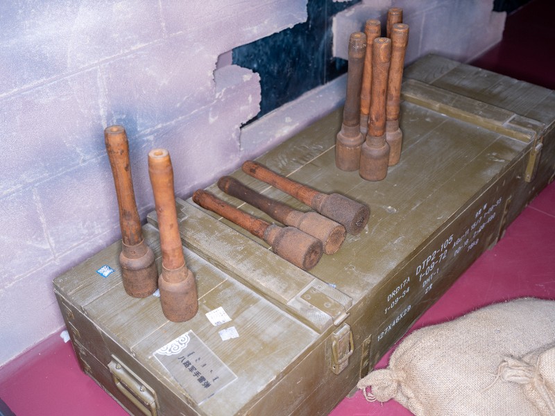 抗日战争时期,八路军骑兵团在桃力民地区驻扎时留存下来的弹药箱和手榴弹,材质为木、铁。现存于桃力民抗日根据地史实陈列馆。