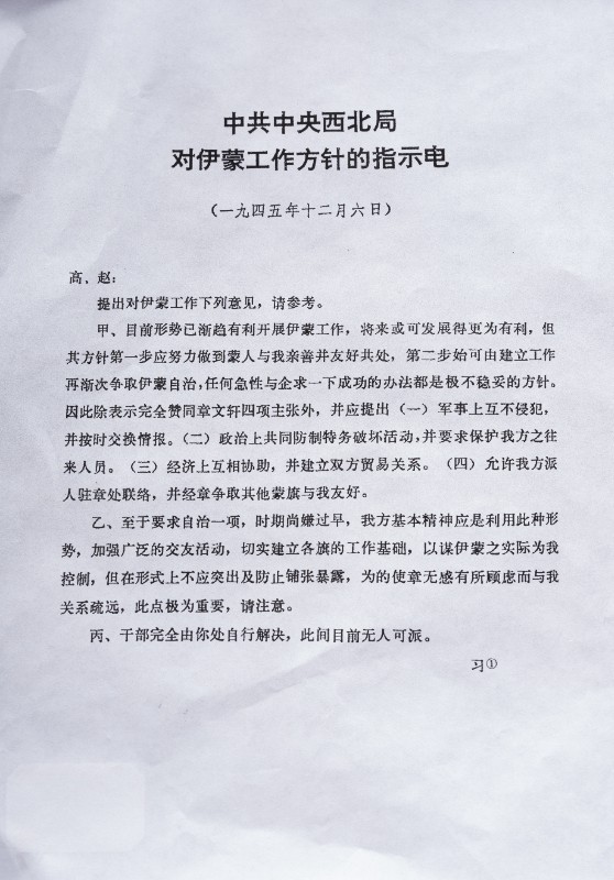 1945年12月6日,中共中央西北局指示如何在伊蒙(盟)开展革命工作。