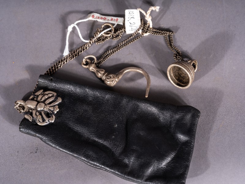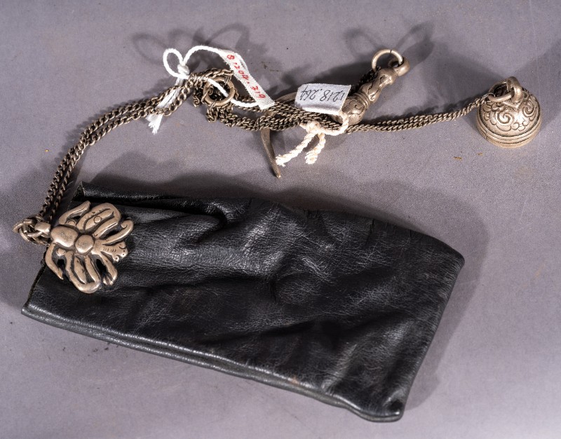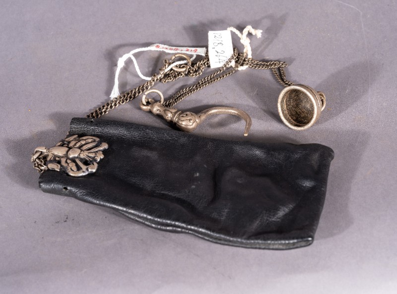 民国时期,深入城川地区中共地下党员使用过的皮质银链雕花烟袋。征集购买、材质皮质银质、基本完整。