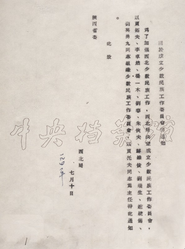1941年7月10日,西北局关于成立少数民族工作委员会成立的通知。