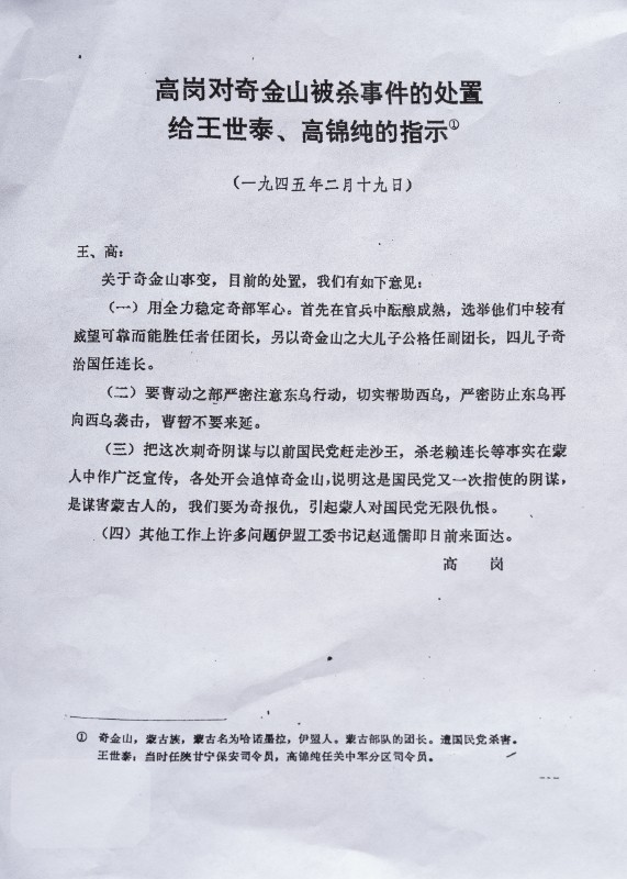 1945年2月29日,高岗对奇金山被杀事件的处置,高岗要求王世泰、高锦纯如何安顿奇金山的革命部队。