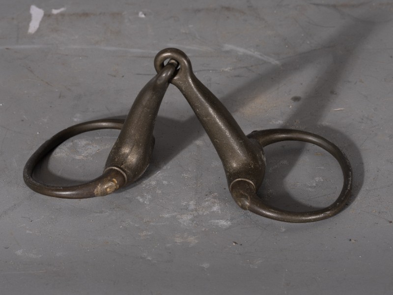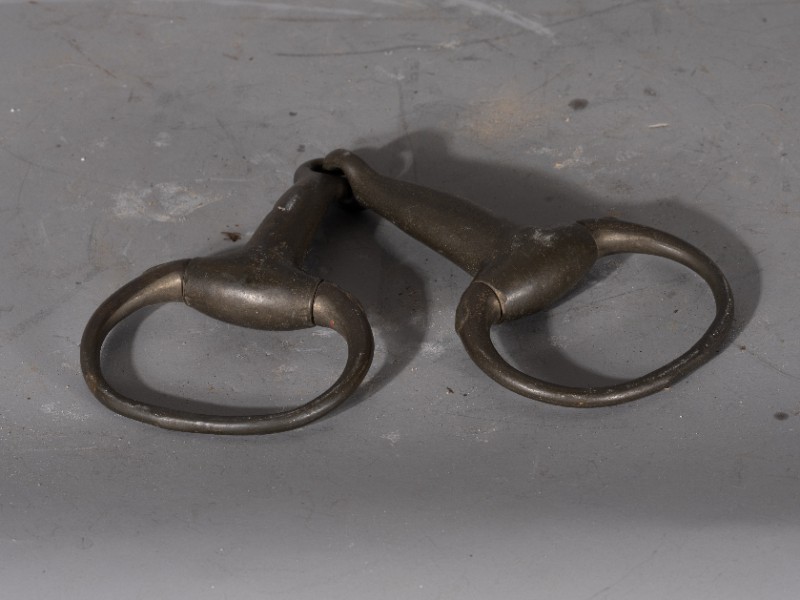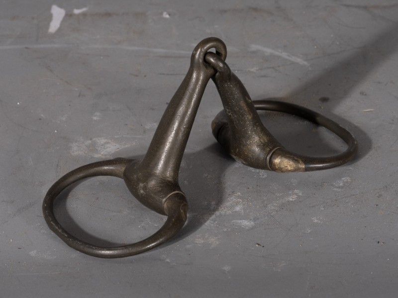 抗日战争时期,八路军骑兵团军官在桃力民地区使用过的军用马嚼子,材质为铁,器型完整。现存于桃力民抗日根据地史实陈列馆。