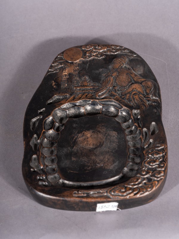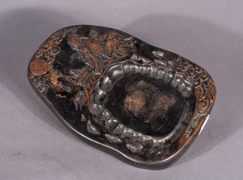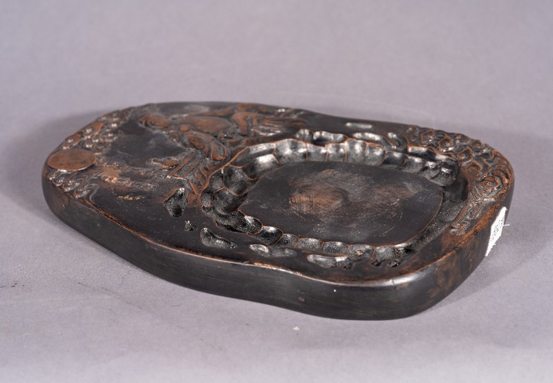 民国时期,城川民族学院师生所使用过的李白夜饮红铜砚台,刻有小篆文字“但愿人长久,千里共婵娟”。征集购买、材质石、基本完整。