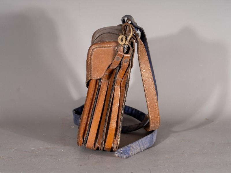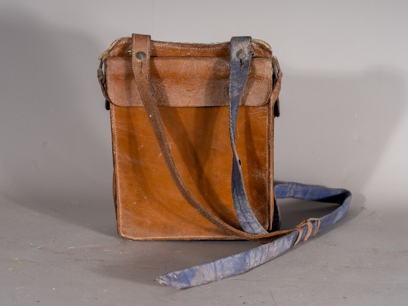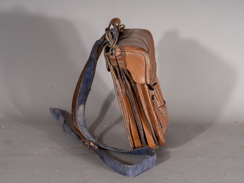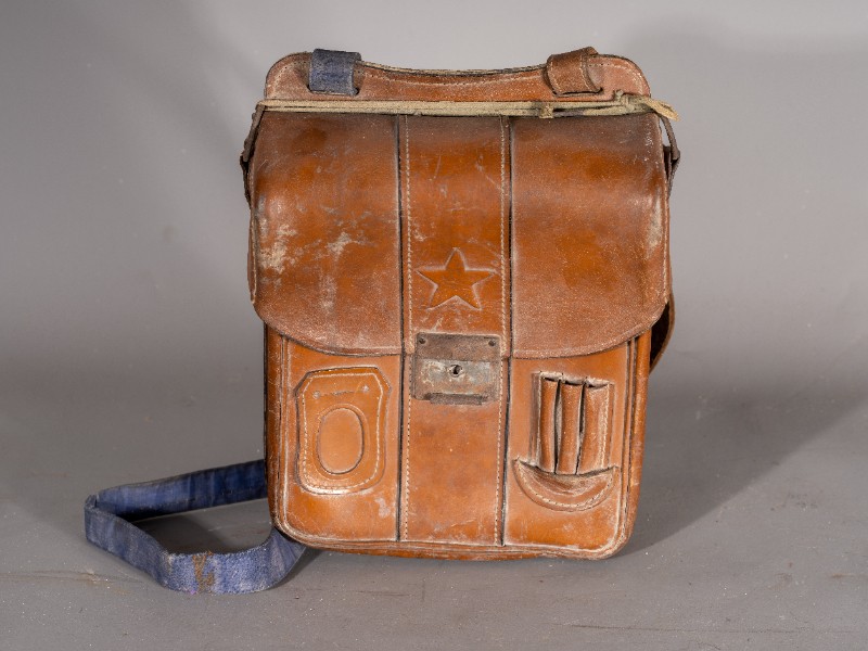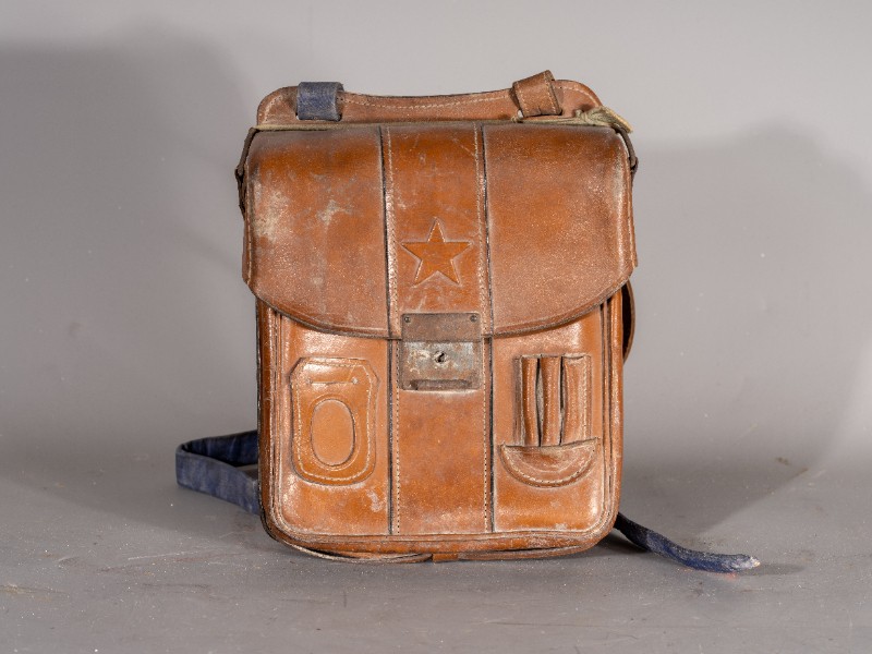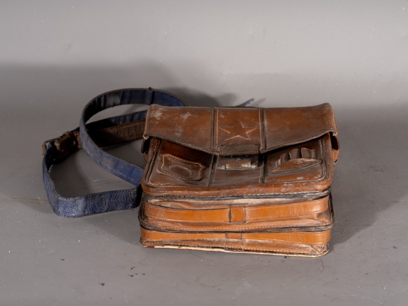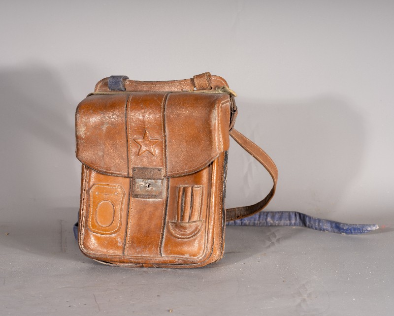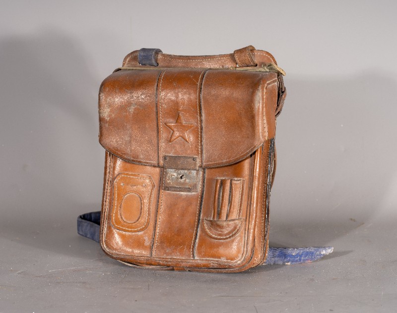民国时期(1938年-1941年),驻扎在鄂尔多斯桃力民地区的八路军骑兵团通讯兵使用过的通讯包,材质为牛皮、铁,器型较完整。现存于桃力民抗日根据地史实陈列馆。