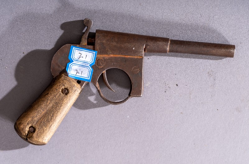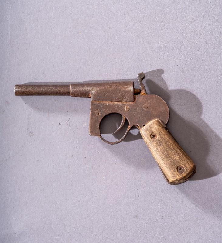 抗日战争时期,第一批进入桃力民地区的共产党员用于防身的老式手枪,材质为铁、木、铜,表面有锈蚀。现存于桃力民抗日根据地史实陈列馆。