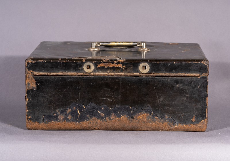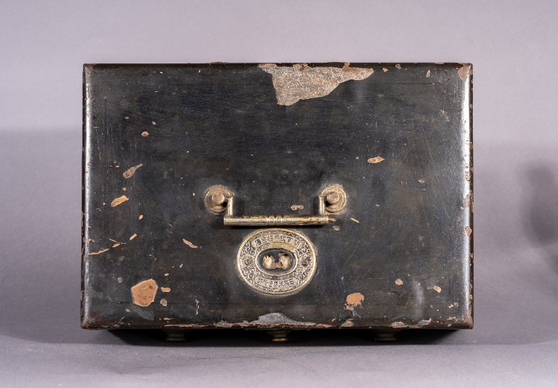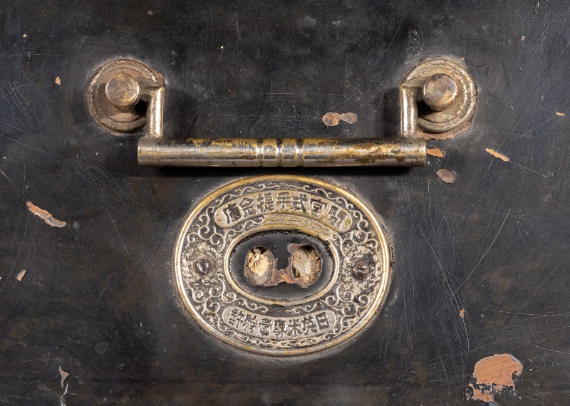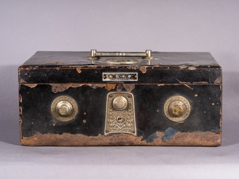 民国时期,日本造手提式金贵保险箱,用于重要文件或财务的携带存放,上刻有“东京市门宫堂制作”。