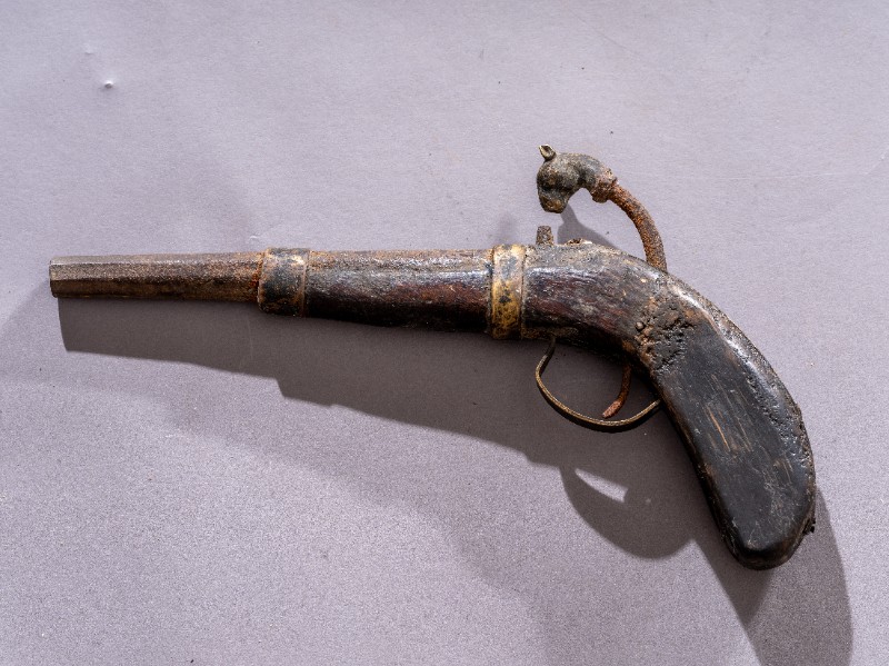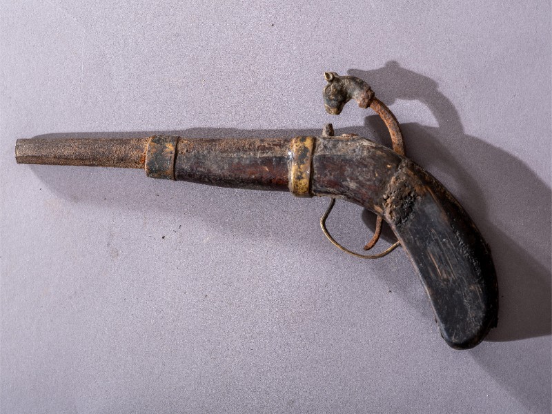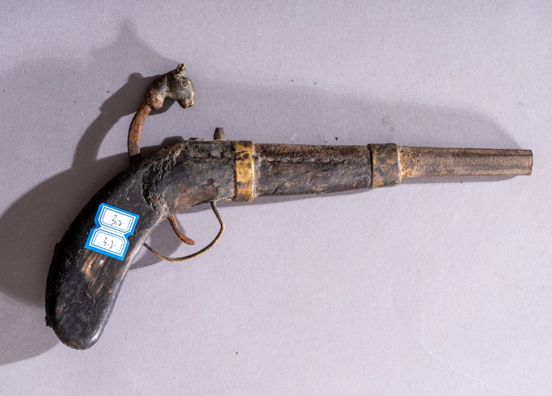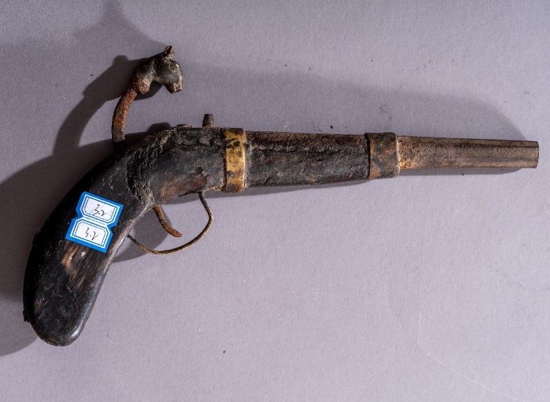 抗日战争时期,第一批进入桃力民地区的共产党员用于防身的老式手枪,材质为铁、木,表面有锈蚀。现存于桃力民抗日根据地史实陈列馆。