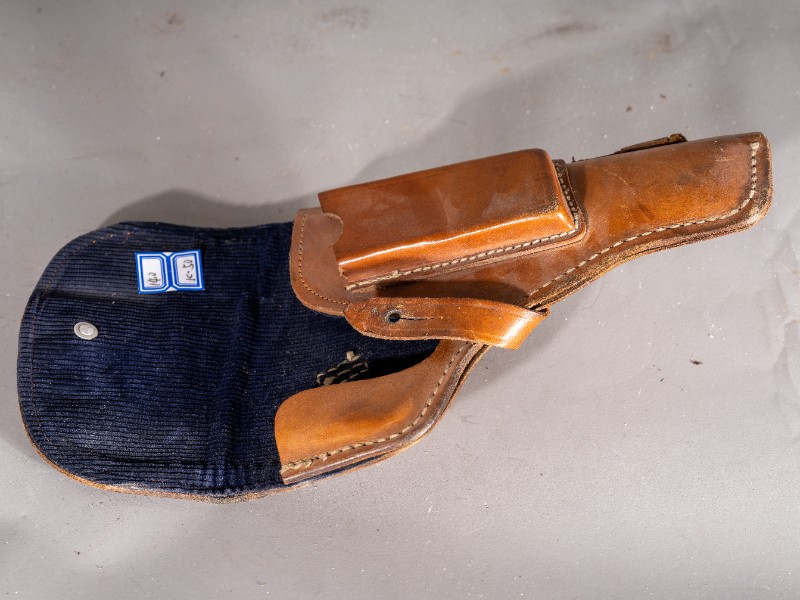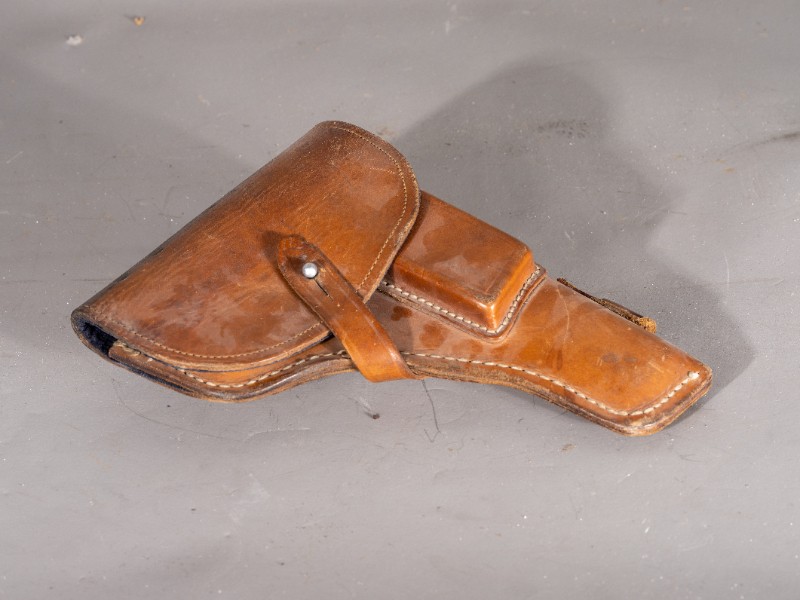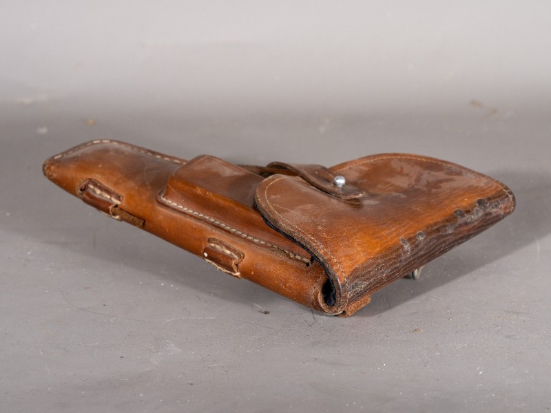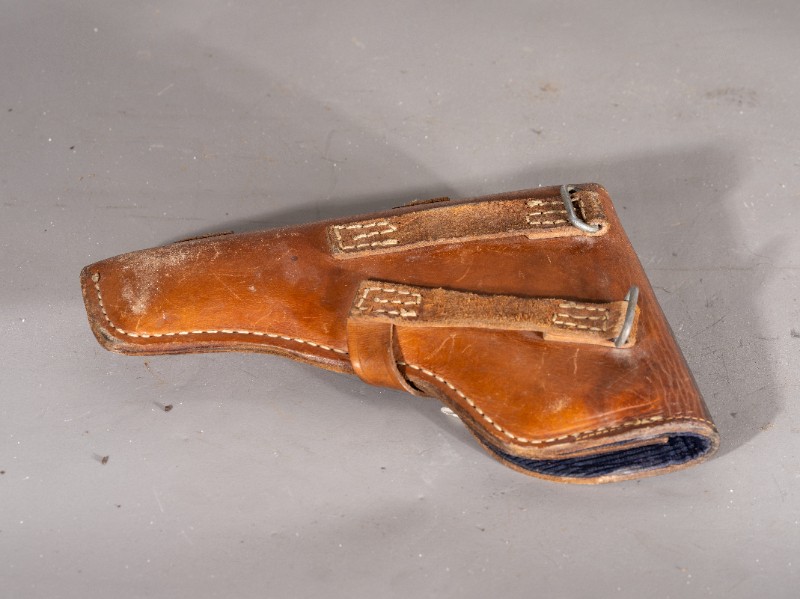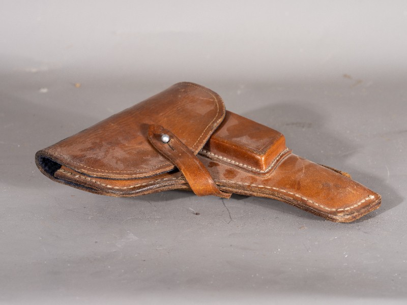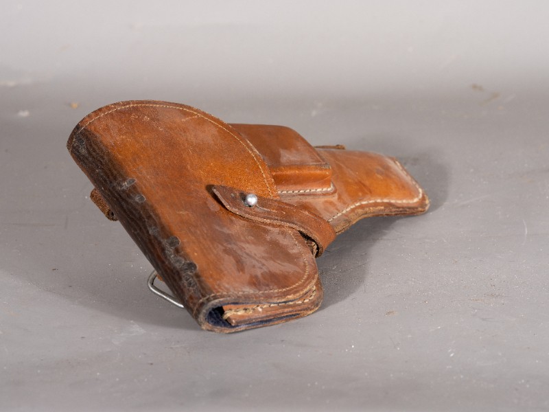 抗战时期,新三师部队军官在桃力民驻扎时使用过的手枪套,枪套目前保存完整,材质为牛皮和布,现存于桃力民抗日根据地史实陈列馆。