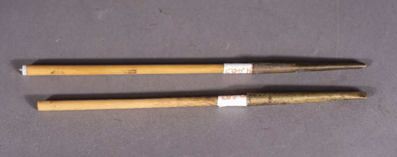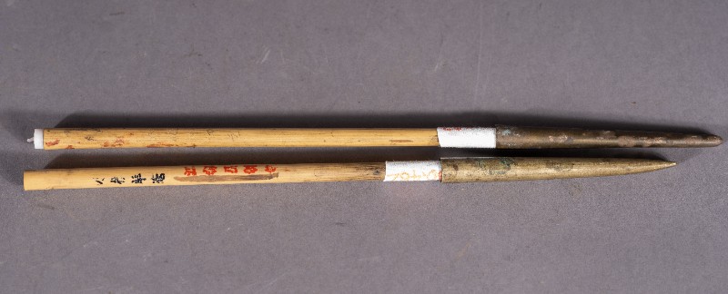 上世纪60年代、刘春使用过的竹杆羊毫铜帽毛笔。刘歌捐赠、材质竹、毛、铜,保存完整。