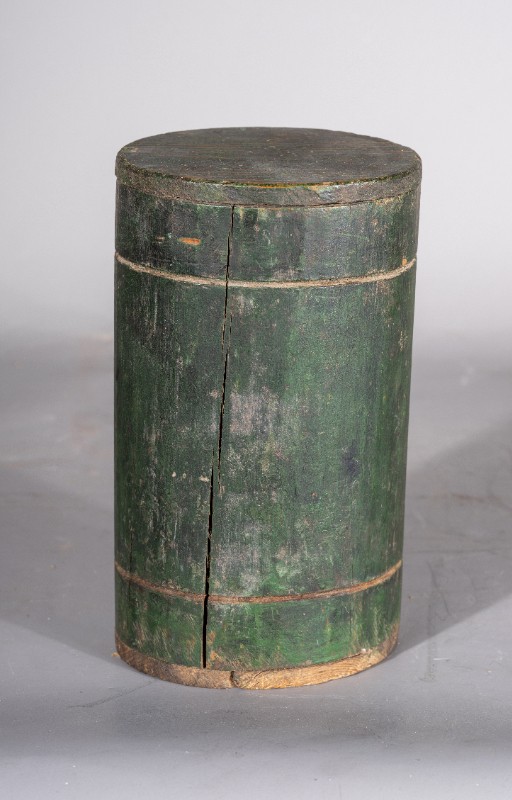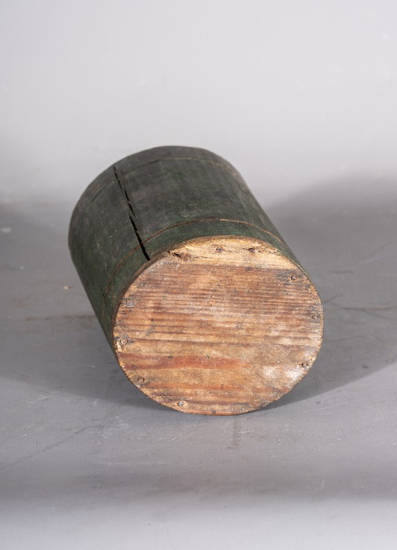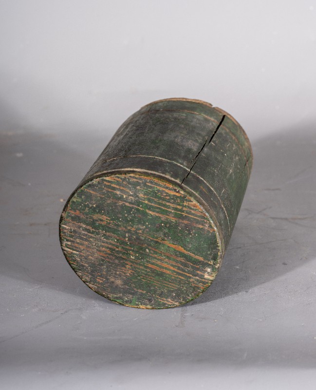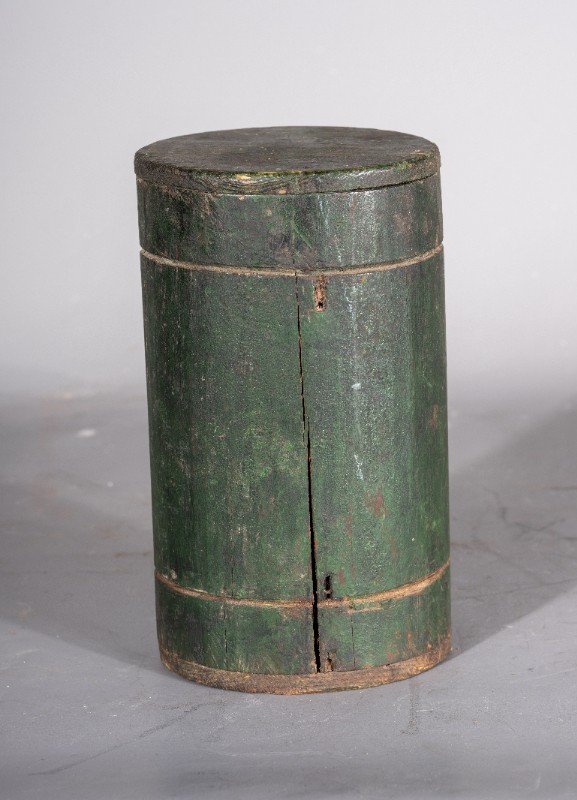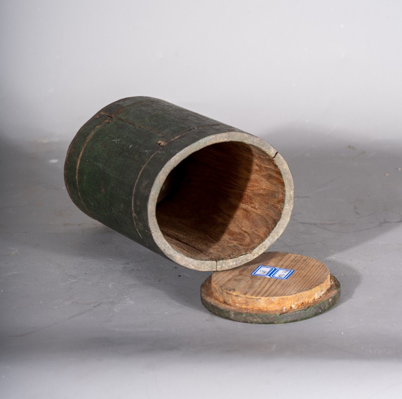 中华民国时期,桃力民地区开明大户使用过的储物木罐,材质为绿色漆面木罐,器型完整,现存于桃力民抗日根据地史实陈列馆。
