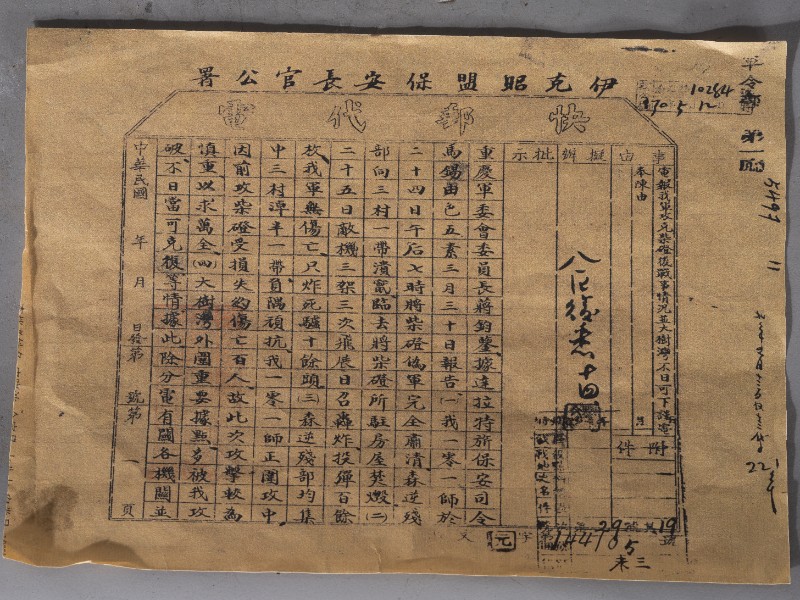 抗日战争时期,国民党傅作义部派兵拔除日伪柴磴据点,后因走漏消息受伏,拔除柴磴据点失败,伤亡百余人的官报。文献现存于桃力民抗日根据地史实陈列馆。