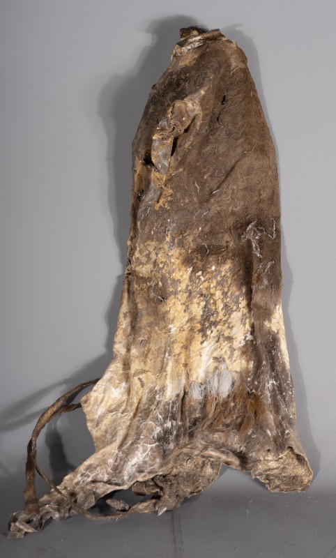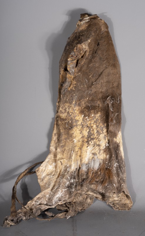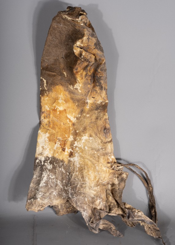 抗日战争时期,在桃力民地区的八路军骑兵团使用过的行军粮袋,材质为牛皮,器型完整。现存于桃力民抗日根据地史实陈列馆。