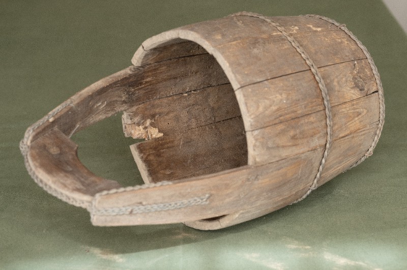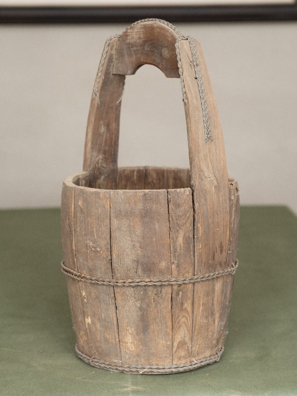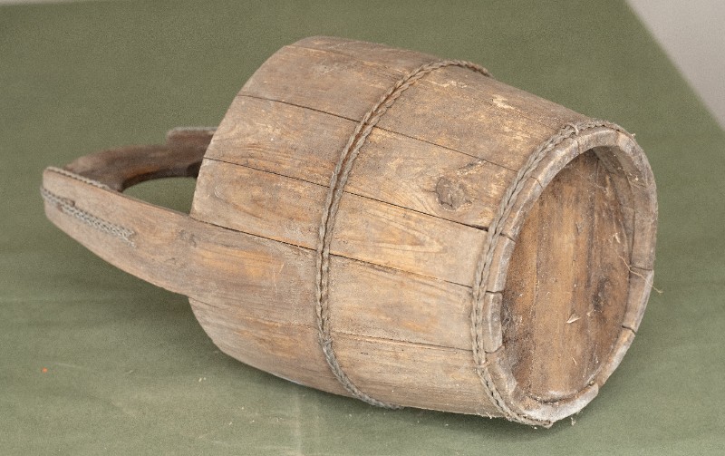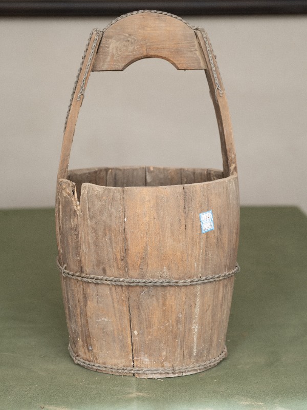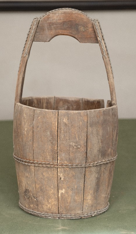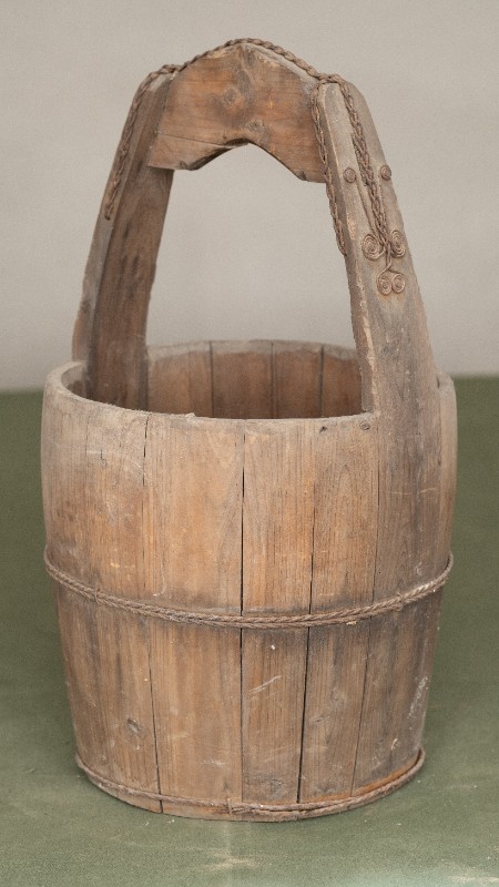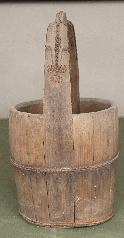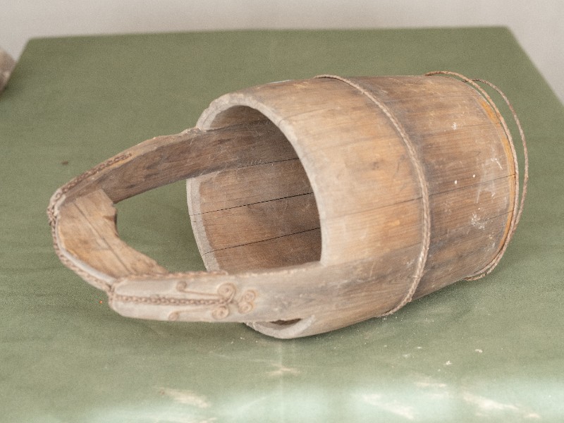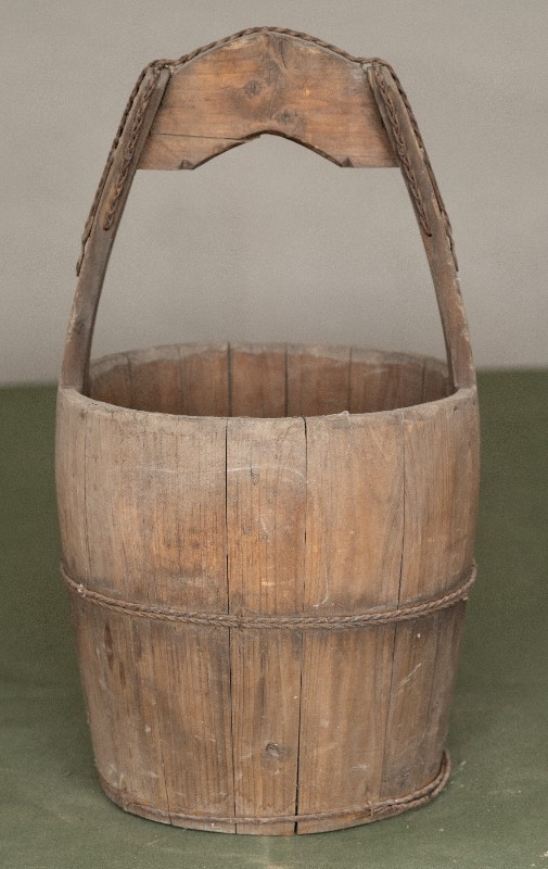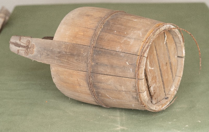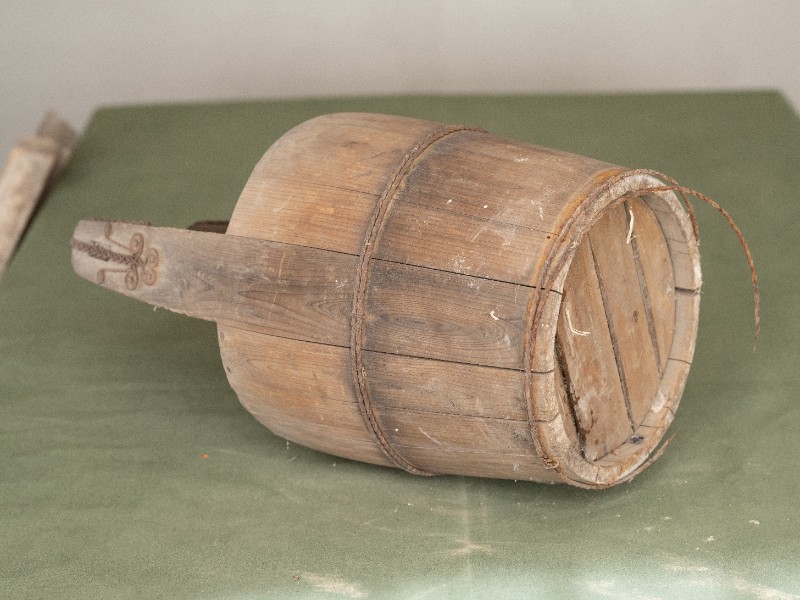 抗日战争时期,新三师官兵驻扎在桃力民地区时炊事班使用过的提梁水桶。材质为木。民间征集、表面有破损,现存于桃力民抗日革命根据地旧址集群新三师政治部复原院落。