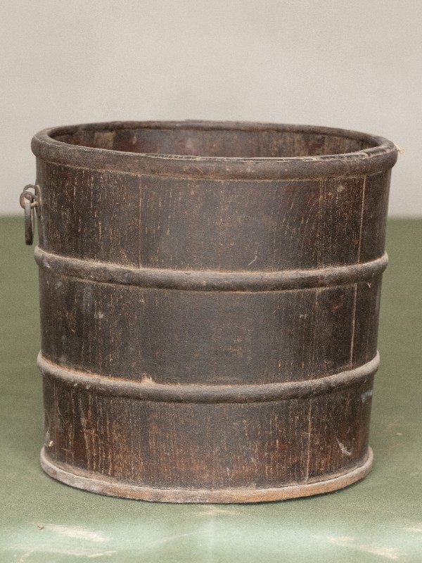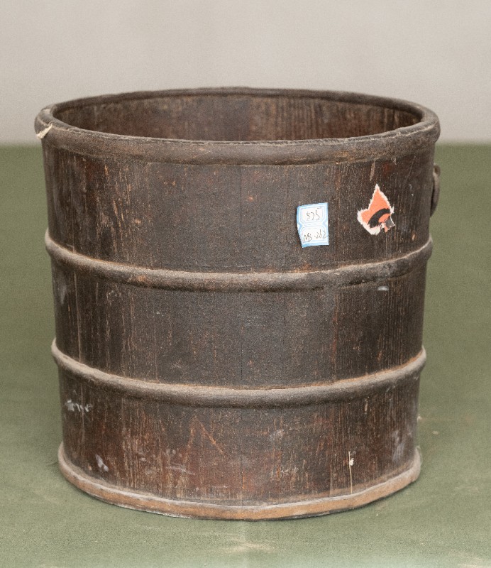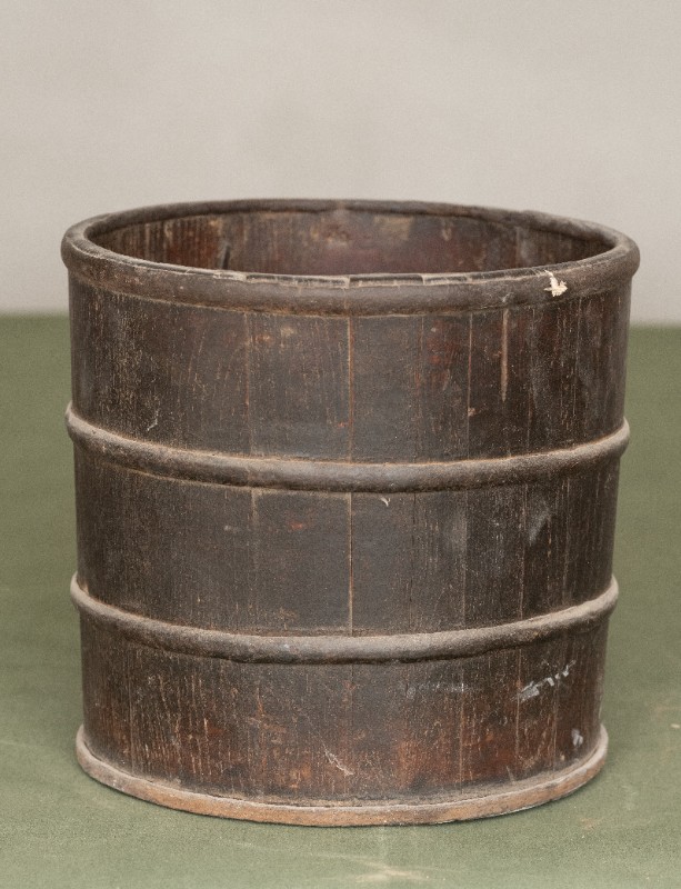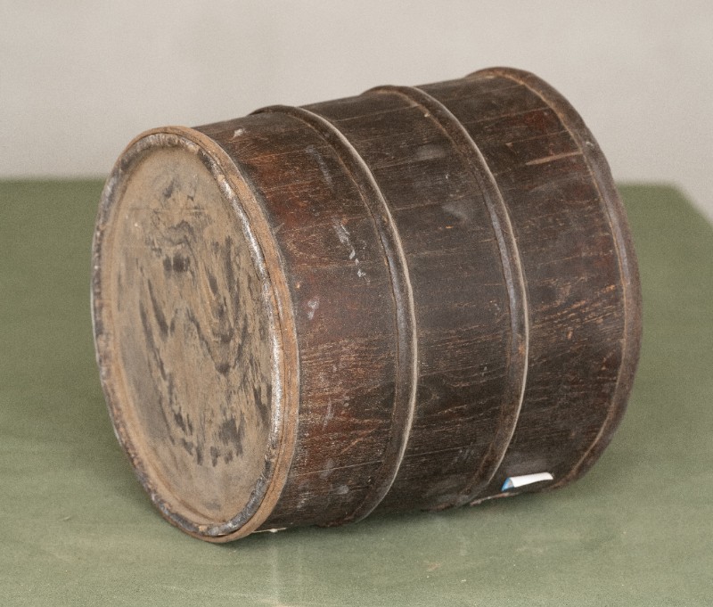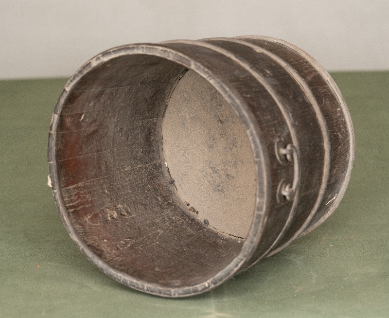 抗日战争时期,新三师官兵驻扎在桃力民地区时炊事班使用过的单耳黑漆木桶。材质为木。民间征集、器型完整,现存于桃力民抗日革命根据地旧址集群新三师政治部复原院落。