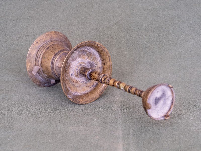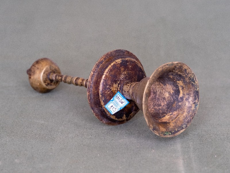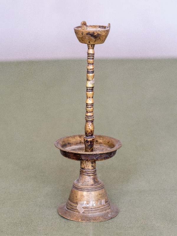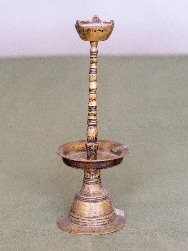 抗日战争时期,新三师军官驻扎在桃力民地区时使用过的黄铜油灯。材质为黄铜。民间征集、器型较完整,现存于桃力民抗日革命根据地旧址集群新三师政治部复原院落。