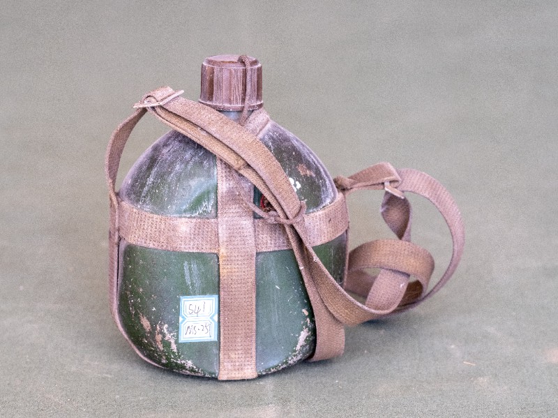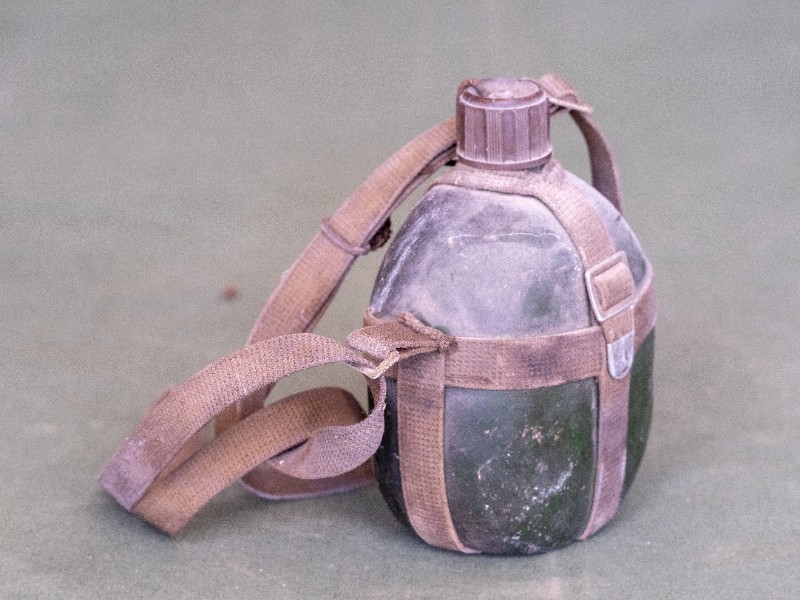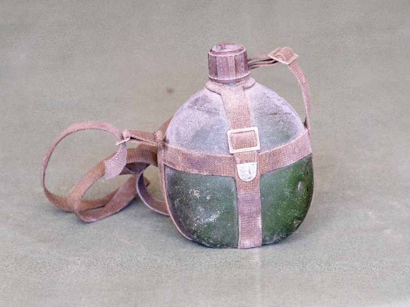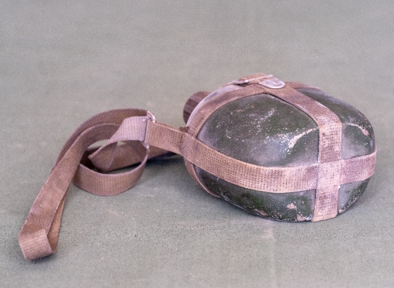 抗日战争时期,新三师军官驻扎在桃力民地区时使用过的军用水壶。材质为铜。民间征集、器型完整。现存于桃力民抗日革命根据地旧址集群新三师政治部复原院落。