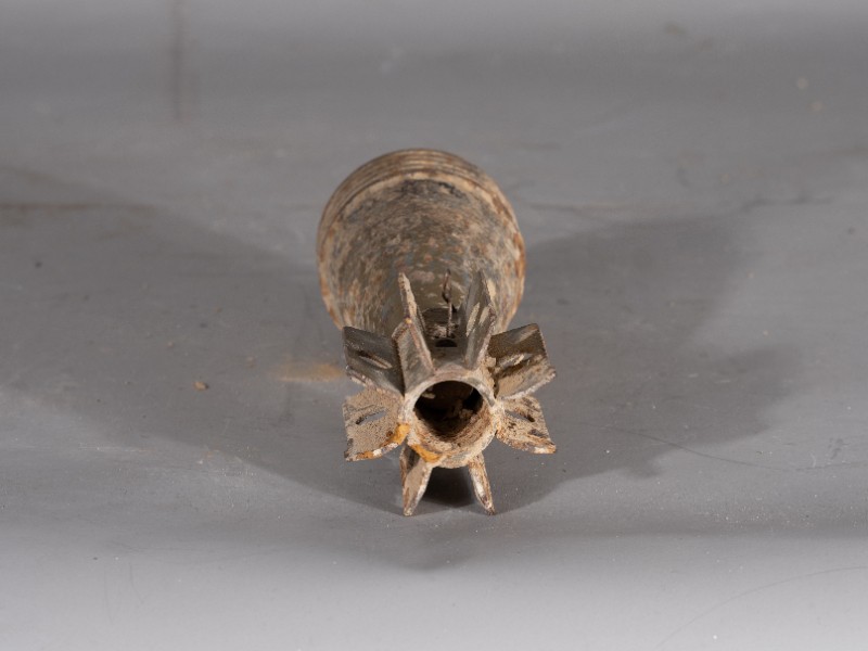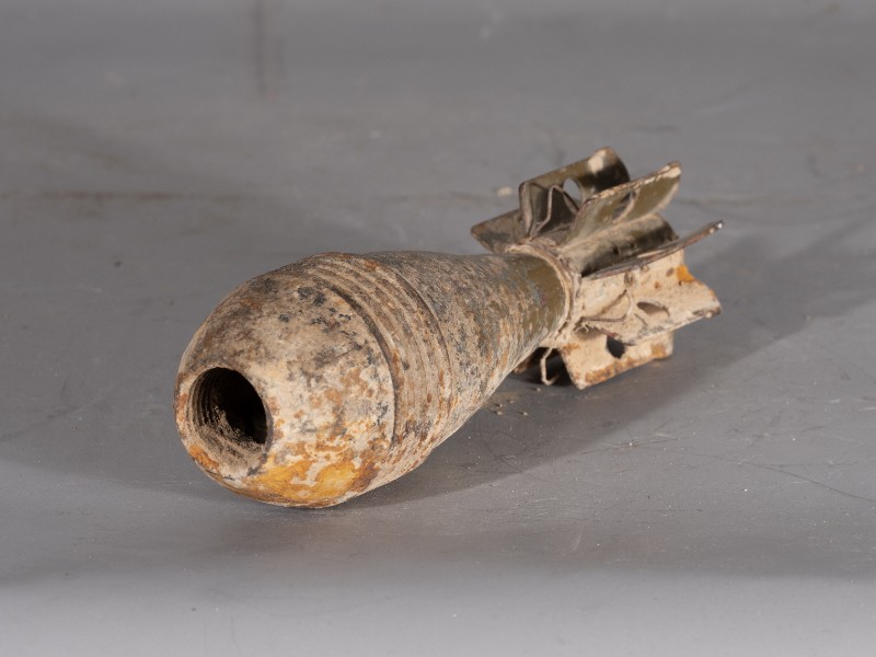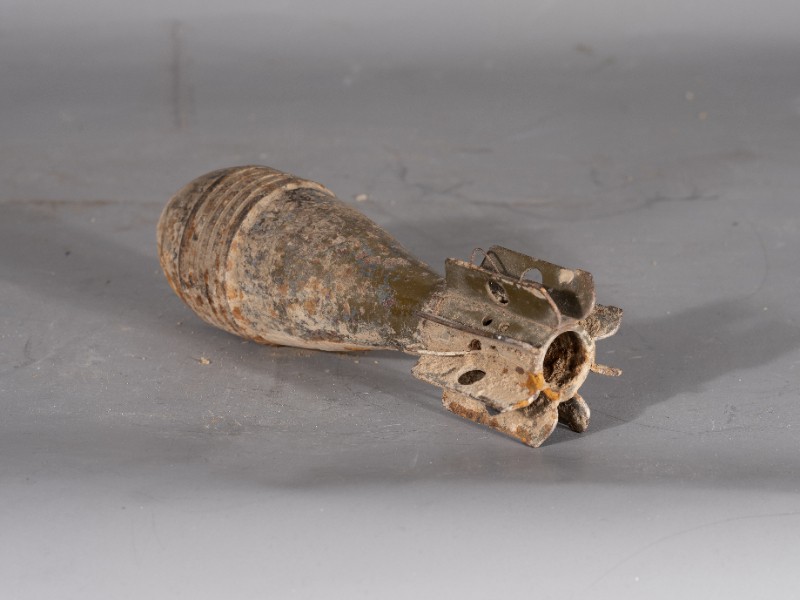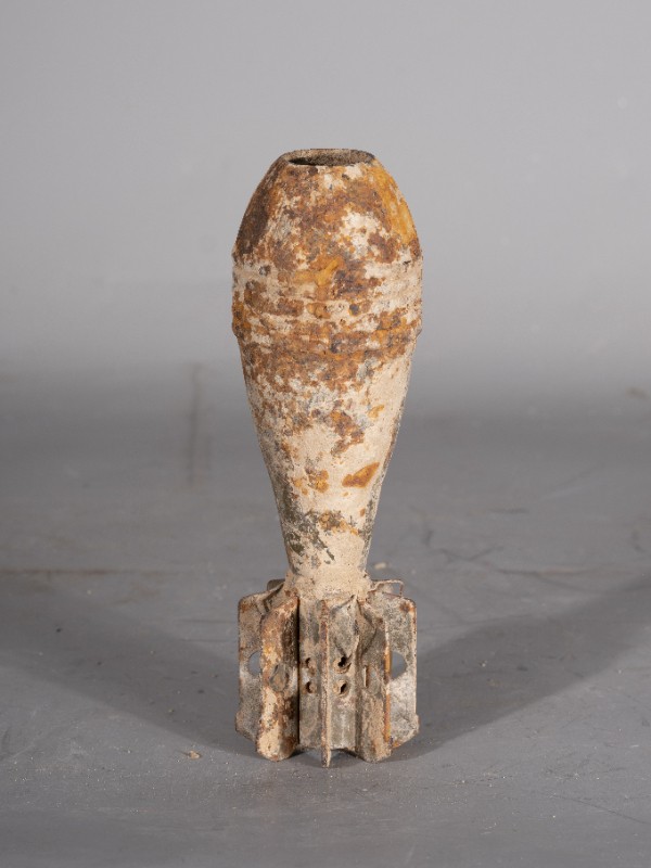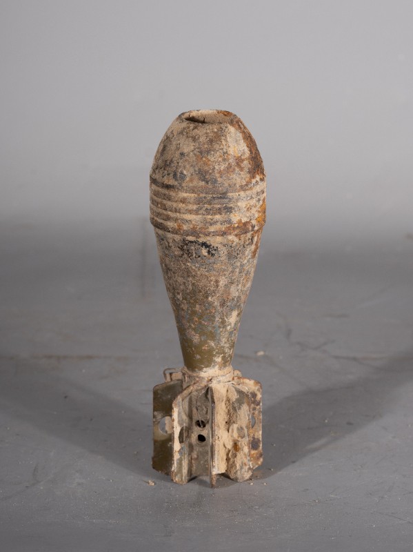 抗日战争时期,八路军炮兵队在桃力民地区作战后留存下来的迫击炮弹,材质为铁,器身有锈蚀,现存于桃力民抗日根据地史实陈列馆。
