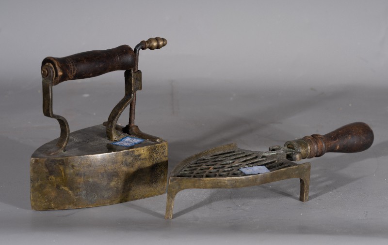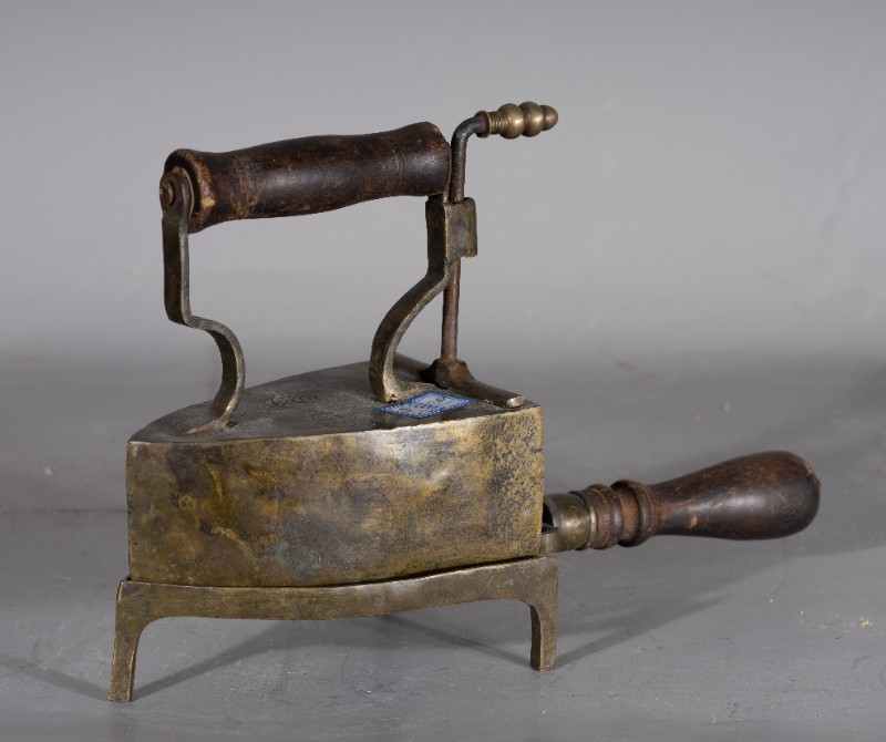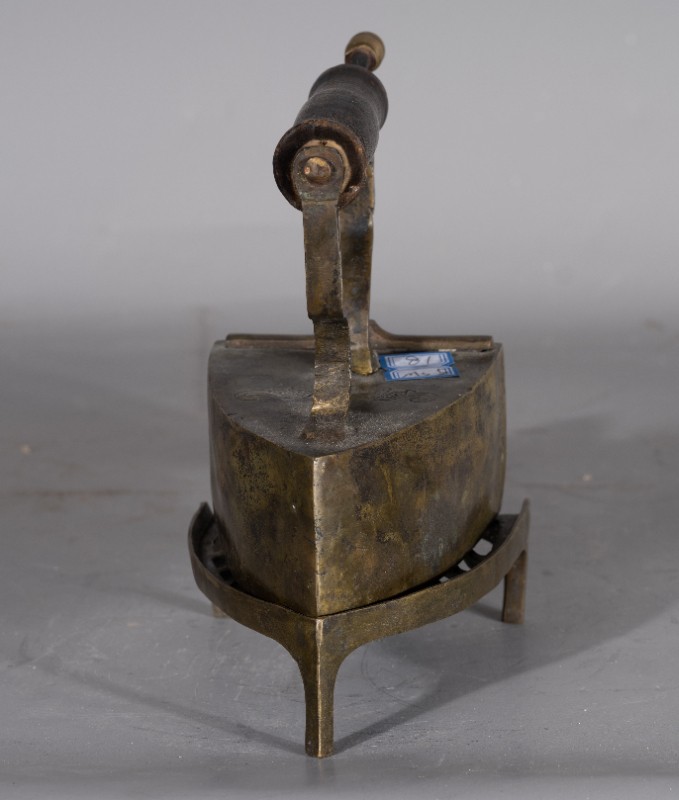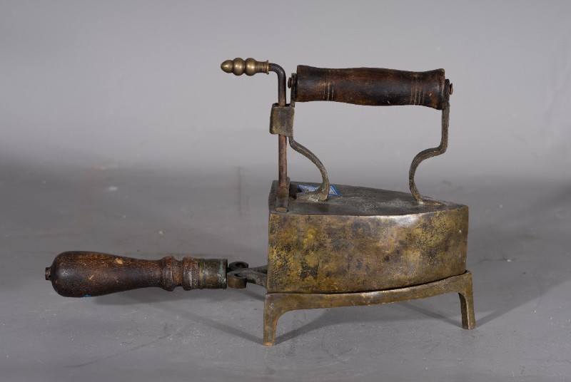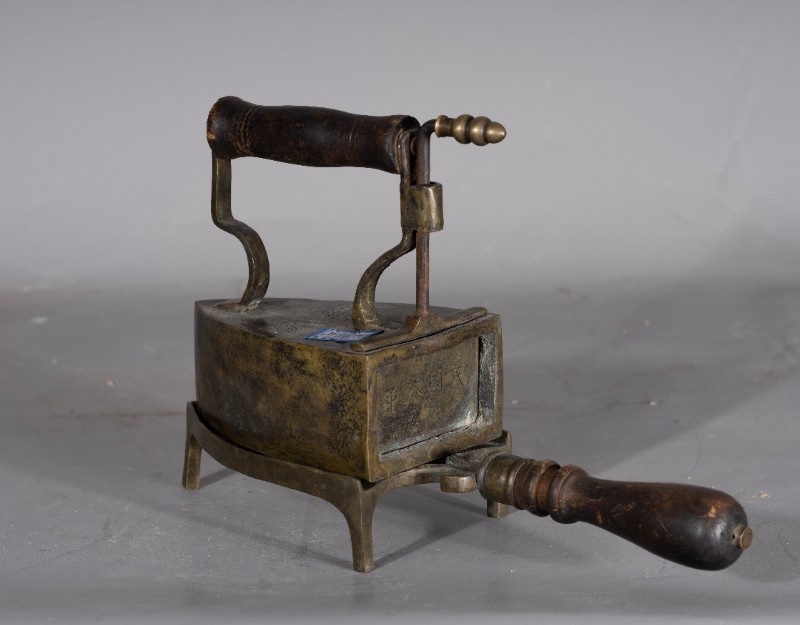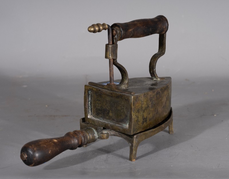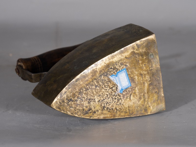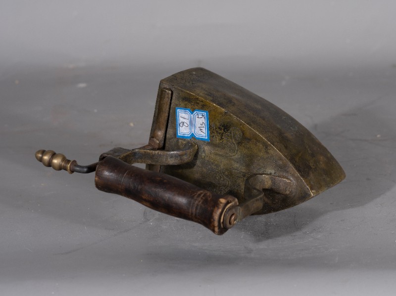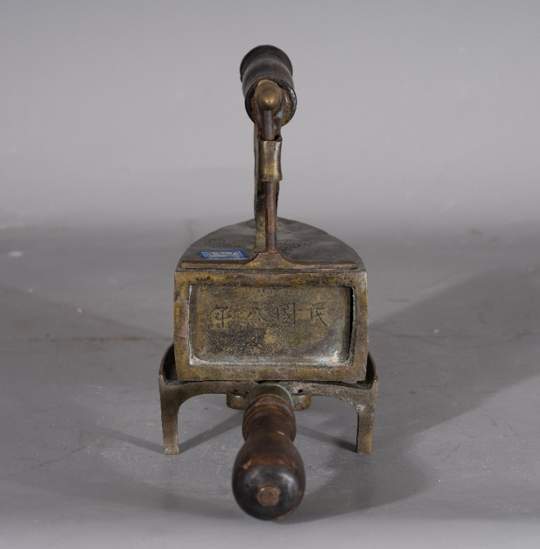 抗日战争时期,郡王府使用过的熨斗,器身刻有:民国八年(1919年),材质为黄铜,表面有锈迹。现存于桃力民抗日根据地史实陈列馆。
