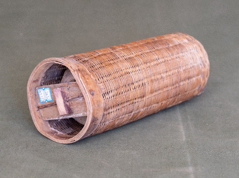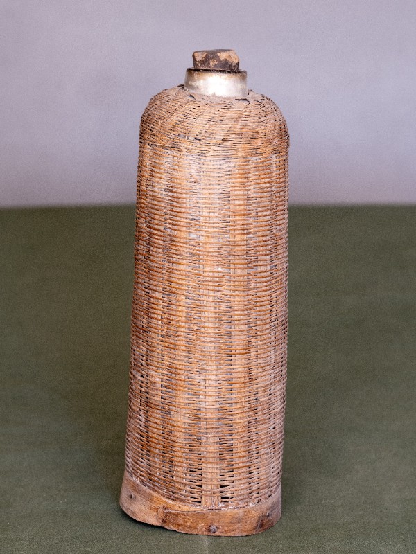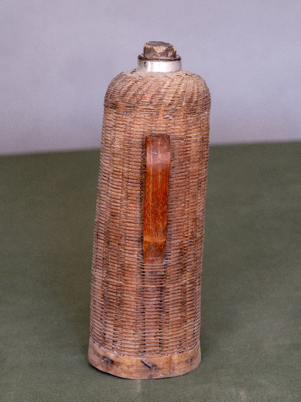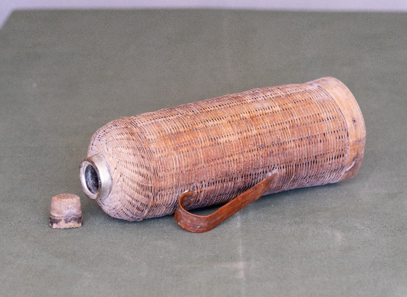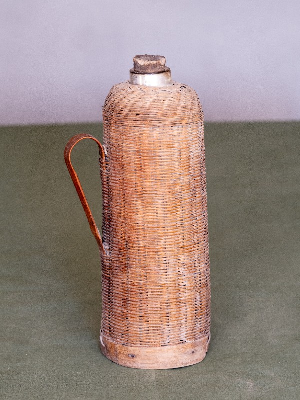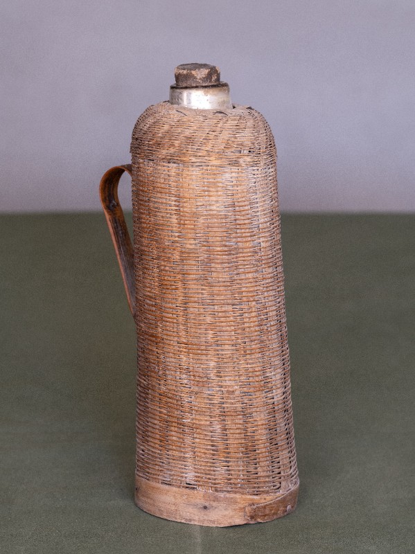抗日战争时期,新三师官兵驻扎在桃力民地区时使用过的竹编暖壶。材质为竹、玻璃。民间征集、器型较完整。现存于桃力民抗日革命根据地旧址集群新三师政治部复原院落。