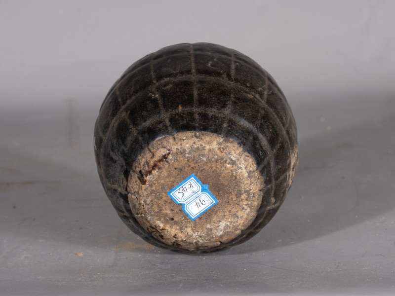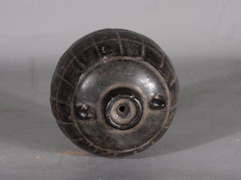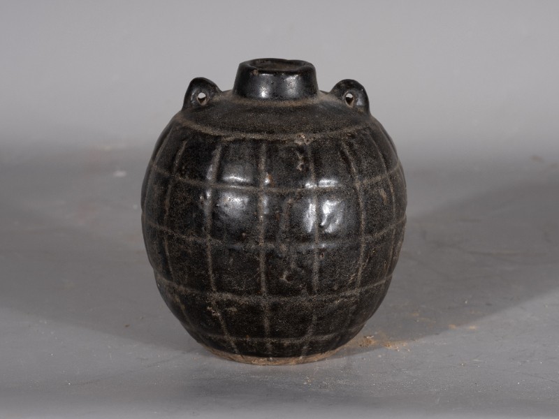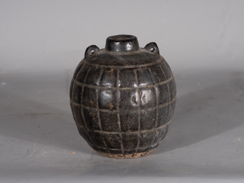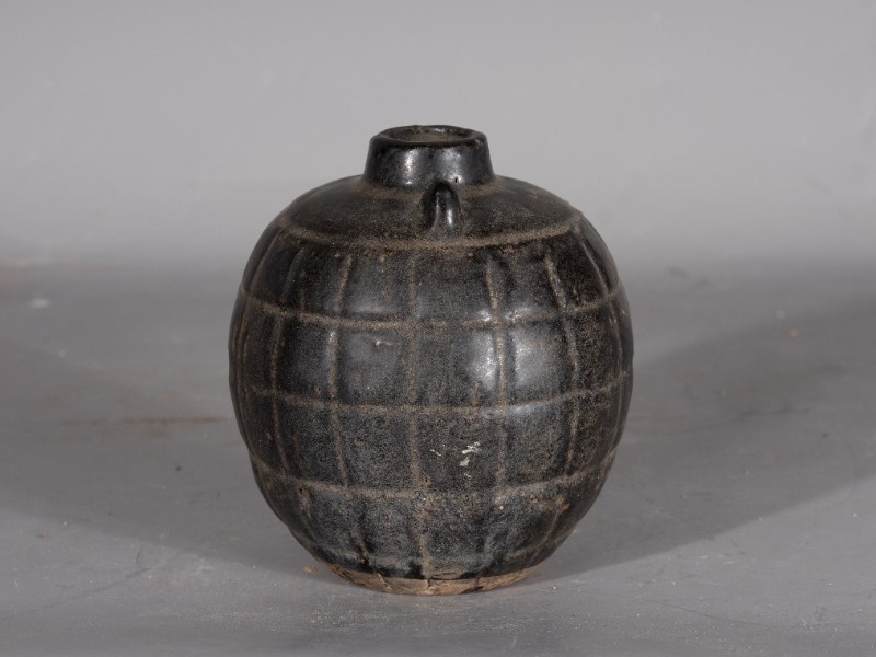 抗日战争时期,桃力民抗日自卫军在桃力民地区自制的瓷雷外壳,材质为黑釉瓷,器型完整,无引线。现存于桃力民抗日根据地史实陈列馆。