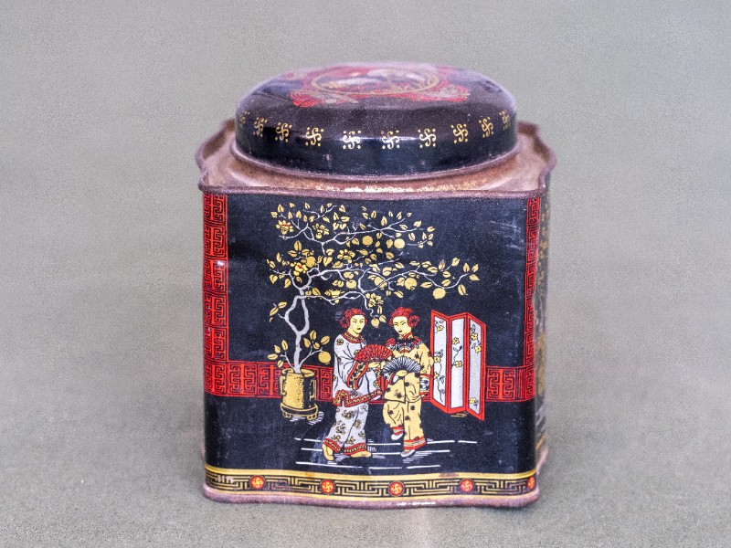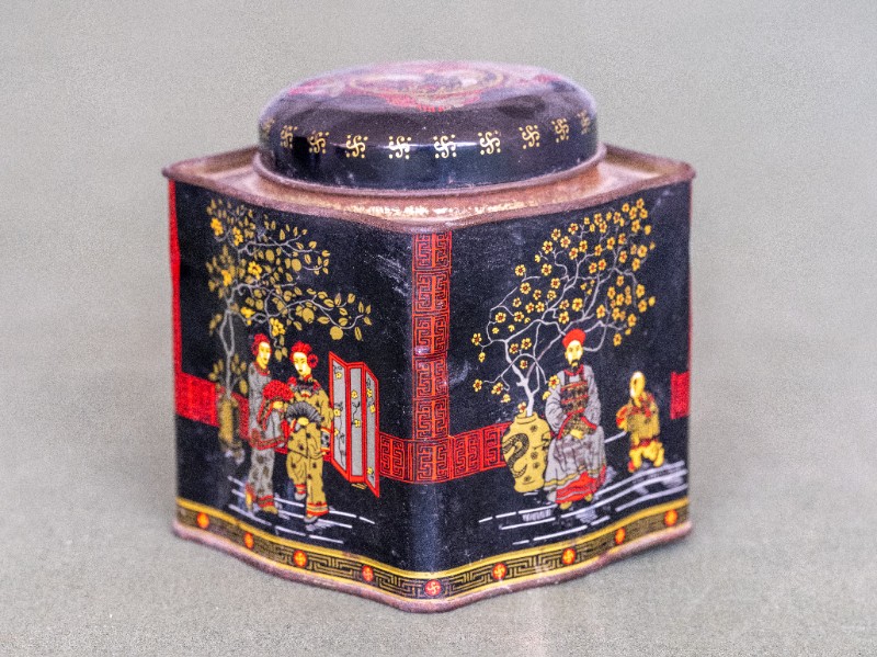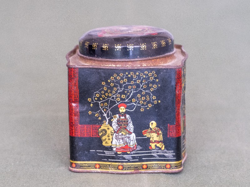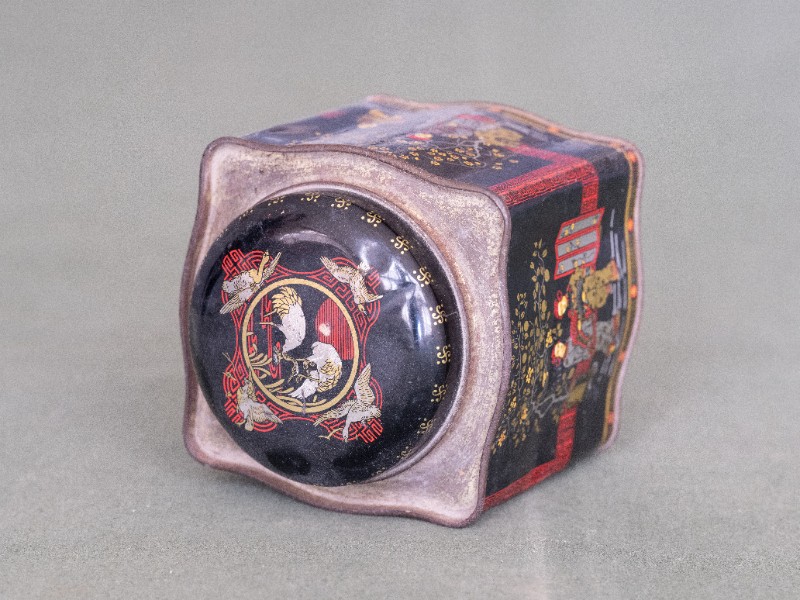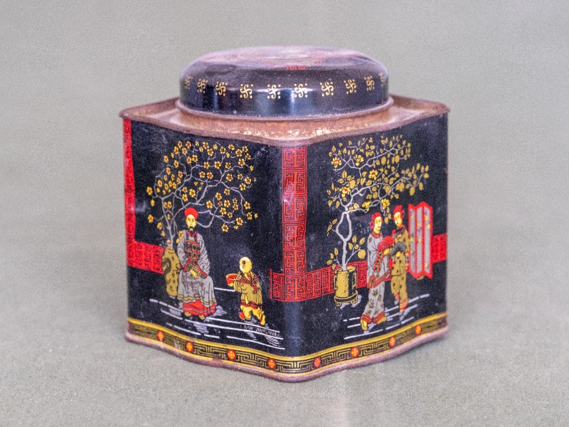 抗日战争时期,新三师军官驻扎在桃力民地区时使用过的彩绘茶罐。材质为铁皮。民间征集、器型较完整,现存于桃力民抗日革命根据地旧址集群新三师政治部复原院落。