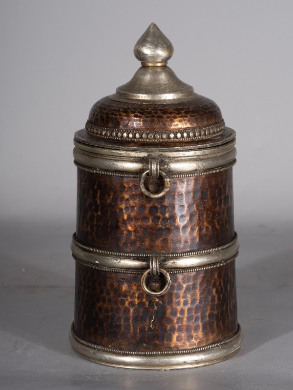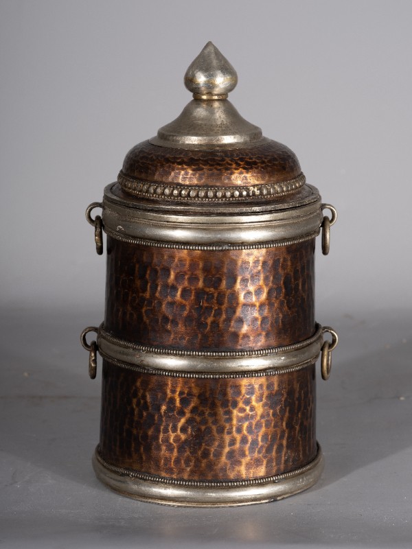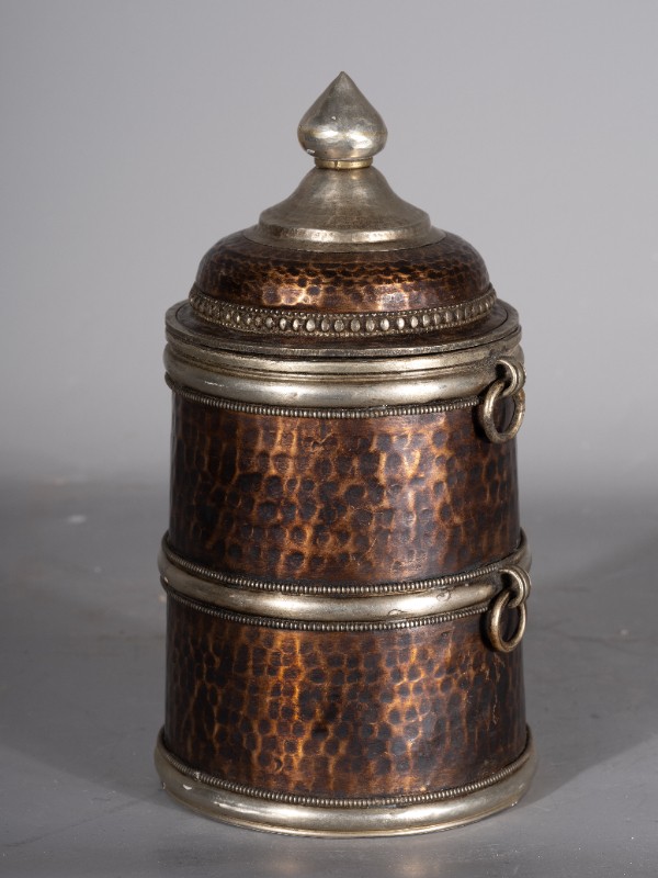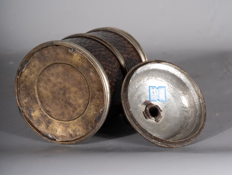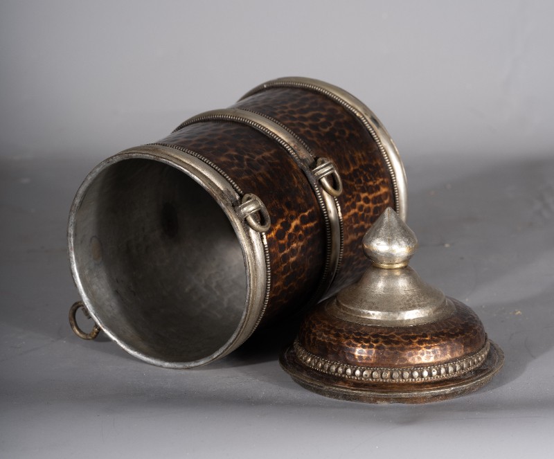 抗日战争时期,郡王府使用过的四耳黄铜马奶桶,材质为黄铜,器身完整。现存于桃力民抗日根据地史实陈列馆。