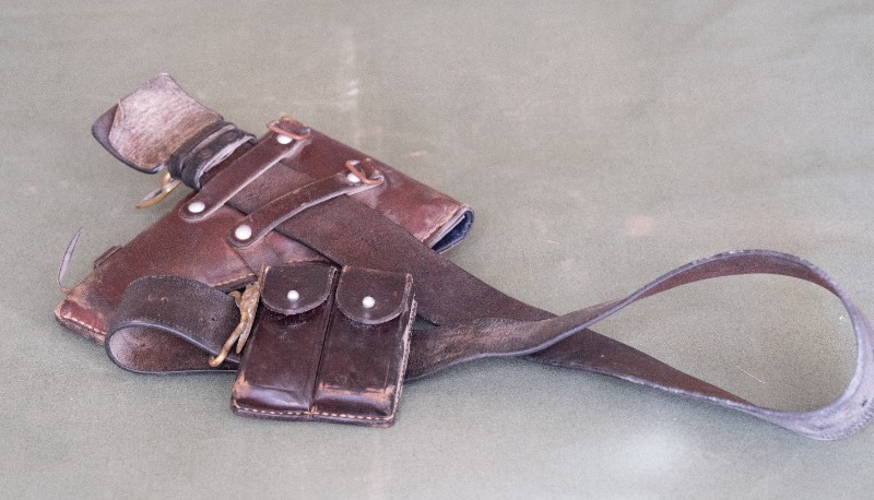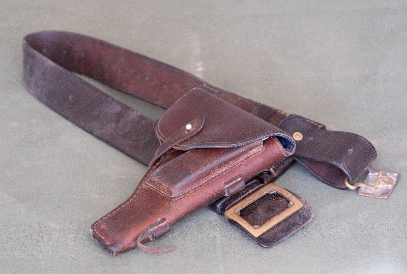 抗日战争时期,新三师军官驻扎在桃力民地区时使用过的枪套、弹夹套及腰带。材质为牛皮。民间征集、器型完整,现存于桃力民抗日革命根据地旧址集群新三师政治部复原院落。