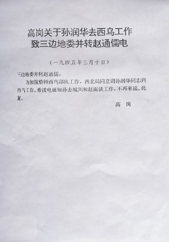 1945年11月12日,中共中央西北局书记习仲勋致电伊盟工委书记赵通儒关于西乌审旗自治政府会暂不成立。现收藏于城川民族学院纪念馆。