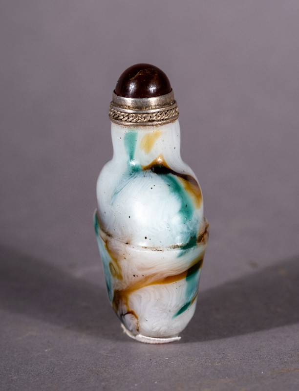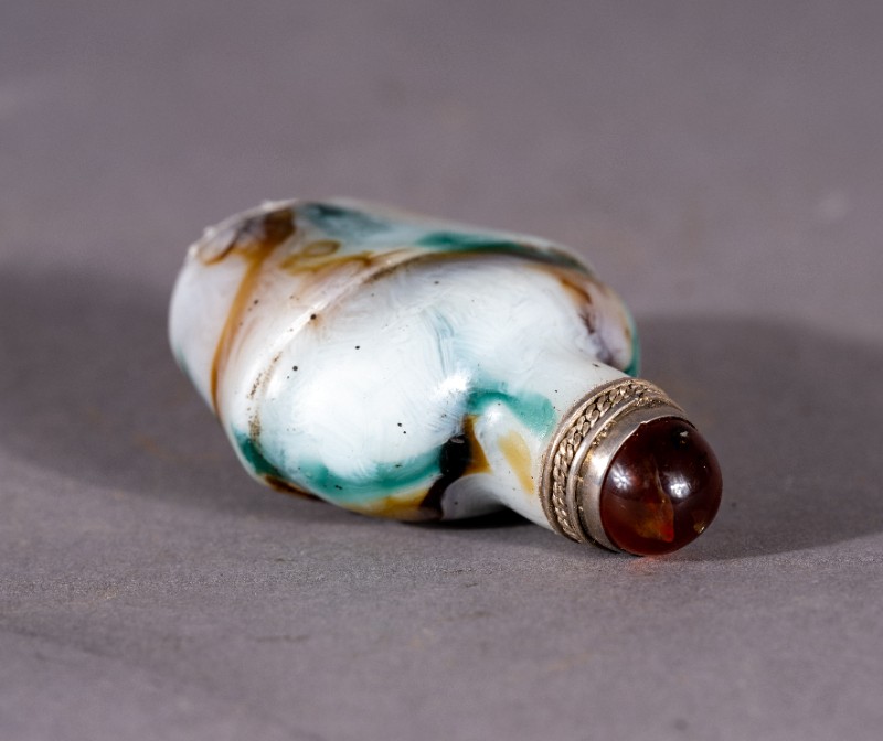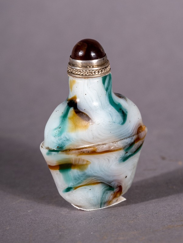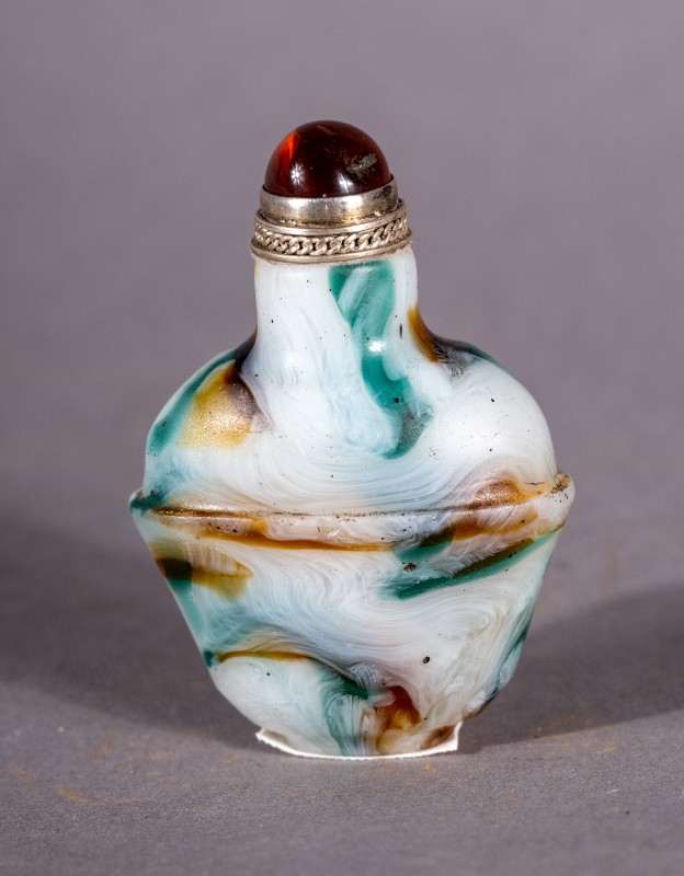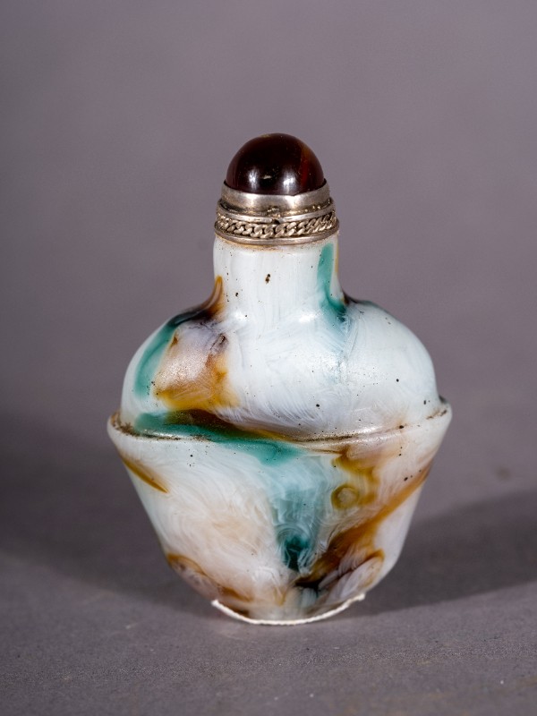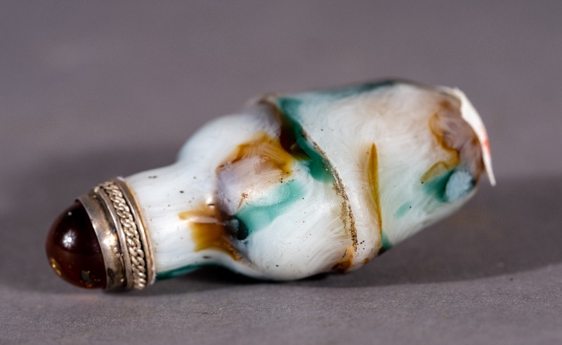 大革命时期,城川当地蒙古族开明人士使用过的清代玉质镶银鼻烟壶,现藏于城川民族学院纪念馆。