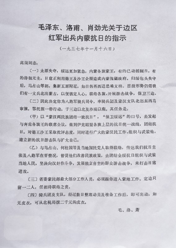 1937年,毛泽东、洛甫、肖劲光关于边区红军出兵内蒙抗日的指示。现收藏于城川民族学院纪念馆。