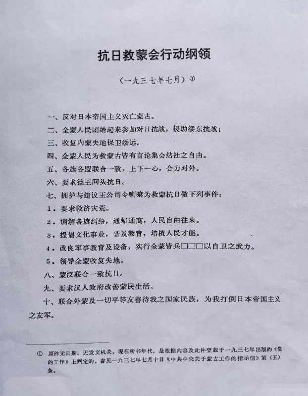 抗日救蒙会行动纲领,现藏于城川民族学院纪念馆。