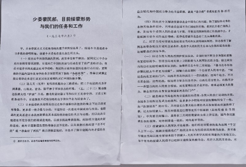 1937年,少委蒙民部:目前绥蒙形势与我们的任务和工作,现收藏于城川民族学院纪念馆。