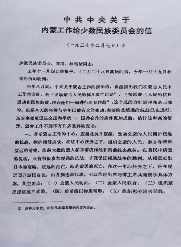 1937年,中共中央关于内蒙古工作给少数民族委员会的信,现收藏于城川民族学院纪念馆。