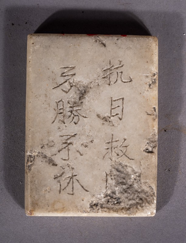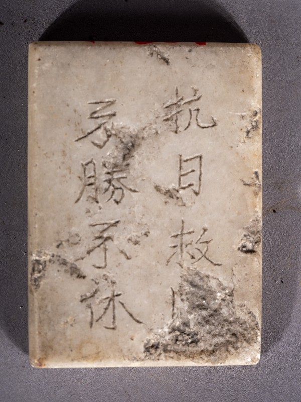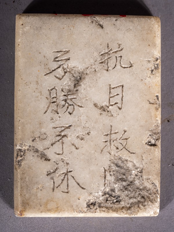 抗战时期,在鄂托克旗城川地下党员使用过的汉白玉砚台,上刻有“抗日救国,不胜不休”字样。现收藏于城川民族学院纪念馆。