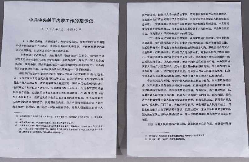 1936年8月24日,中共中央关于内蒙工作的指示信。现收藏于城川民族学院纪念馆。