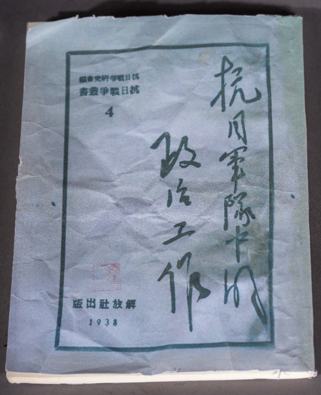 入驻城川地区的八路军使用过的革命书籍《抗日军队中的政治工作》封面,与1938年由解放社出版,收藏于城川民族学院纪念馆。