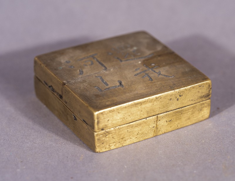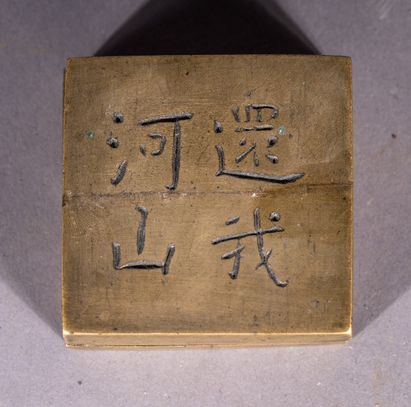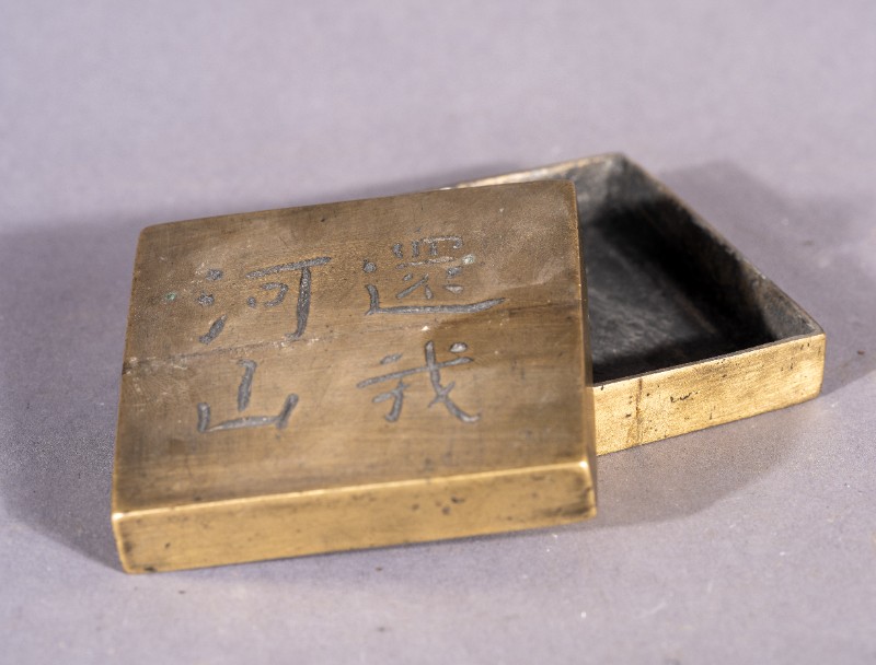 抗战时期,鄂托克旗城川民族学院老师使用过的黄铜墨盒,正面刻有“还我河山”字样,现收藏于城川民族学院纪念馆。