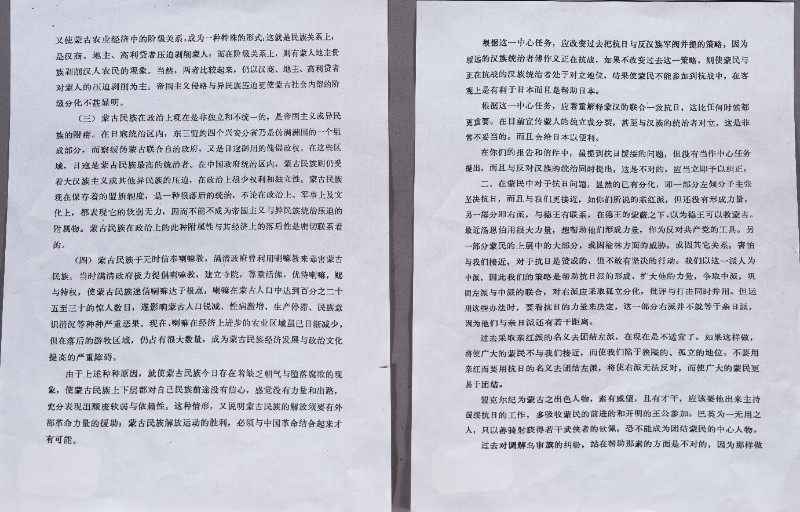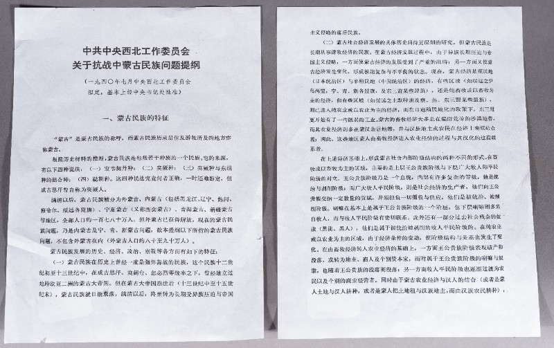 1940年7月,中共中央西北工作委员会关于抗战中蒙古问题提纲文件,提出团结蒙古族人民的政策方针。现收藏于城川民族学院纪念馆。