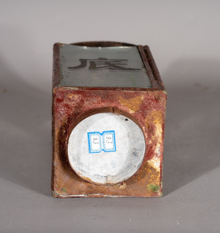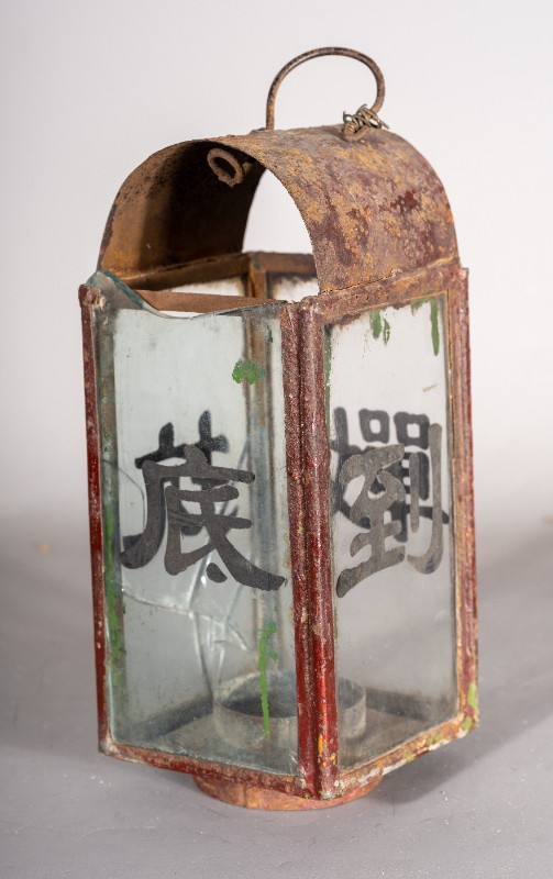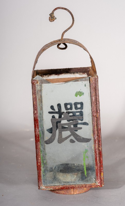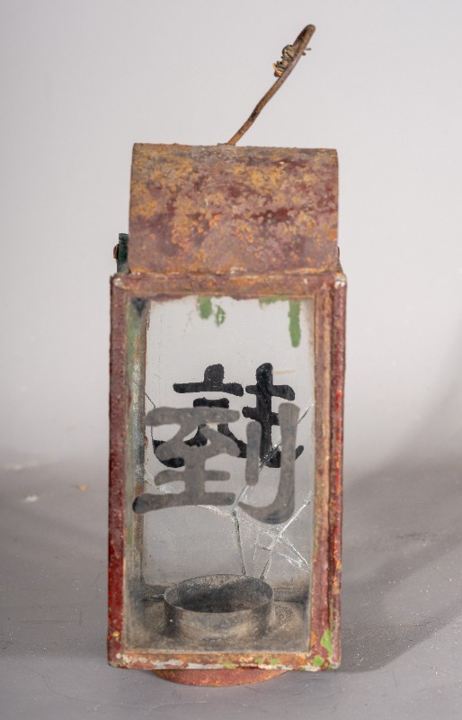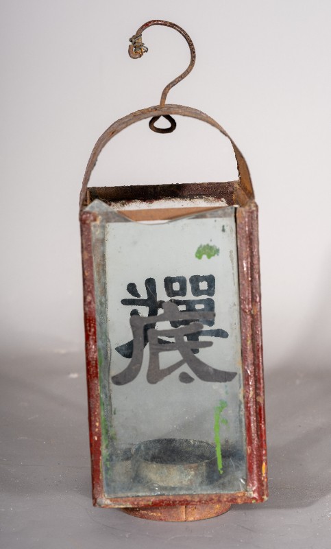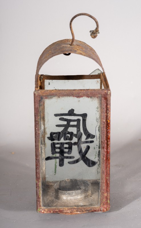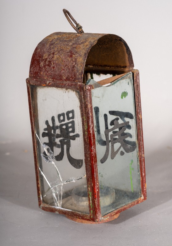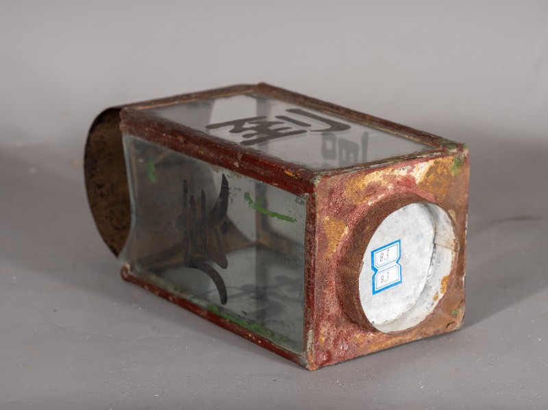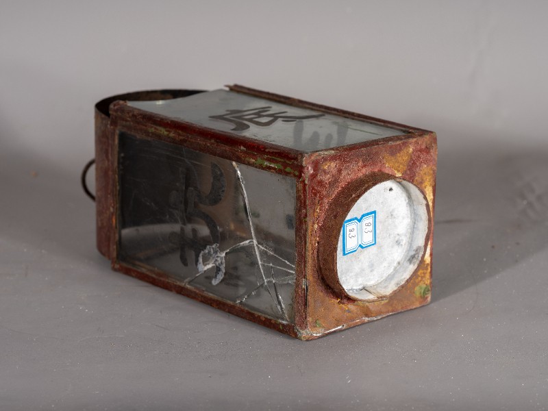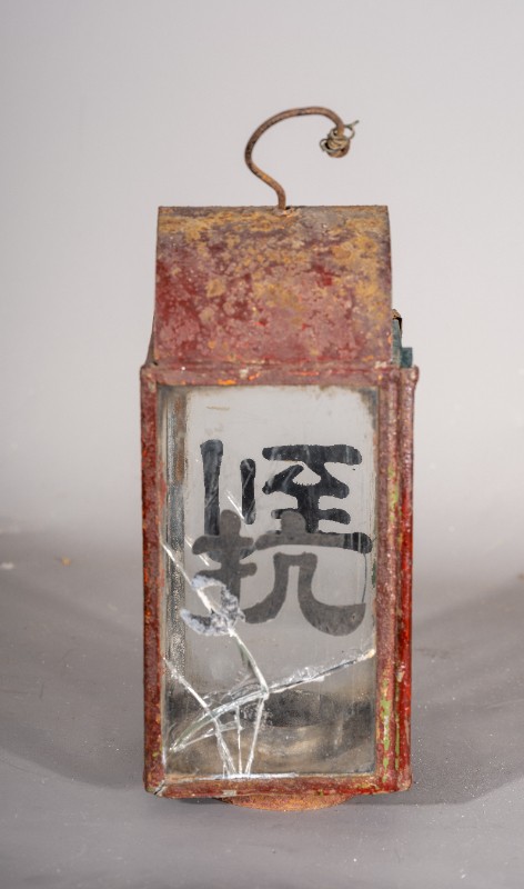 抗战时期,煤油灯笼,灯身玻璃写有“抗战到底”四个字,民间征集、铁、玻璃、灯身有铁锈 、玻璃有破损、现存于桃力民抗日根据地史实陈列馆。