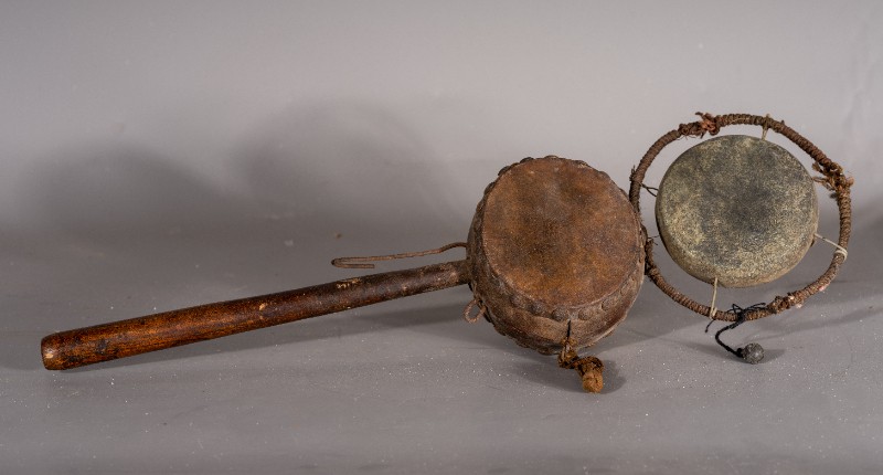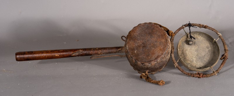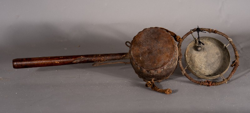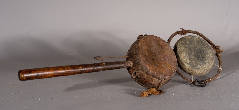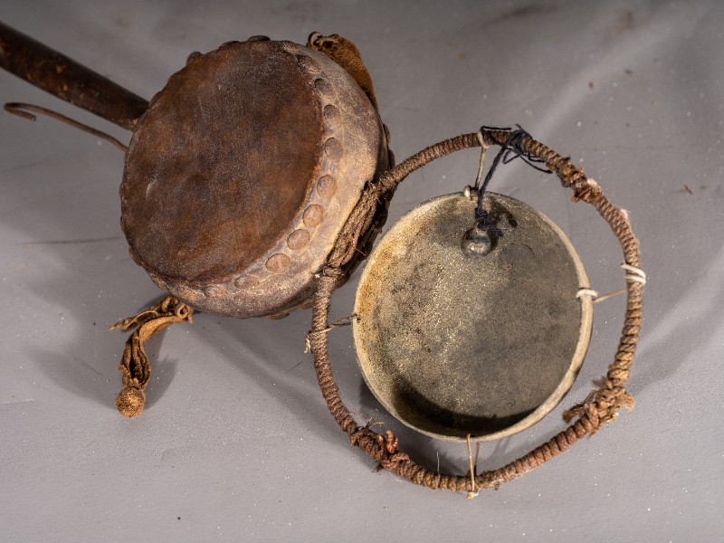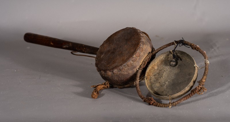 拨浪鼓,货郎专用,民间征集,质地铁、木、铜、麻、皮,器型较完整(略有破损),1934-1935年杨子华、韩是今、赵通儒等革命前辈在鄂尔多斯地区开展党的地下工作时曾扮作货郎使用过该物件。现存于桃力民抗日根据地史实陈列馆