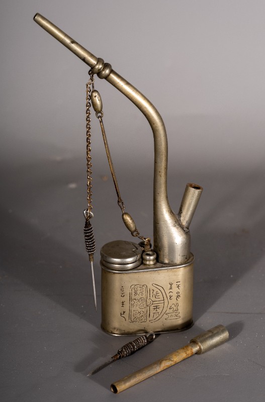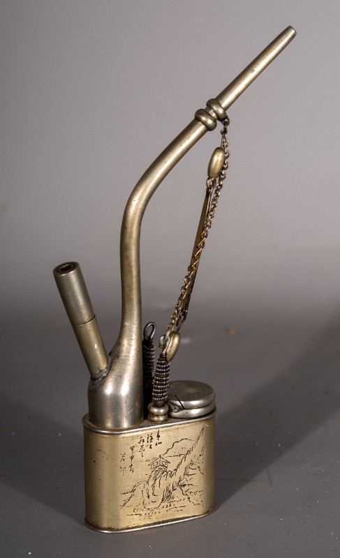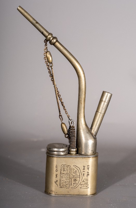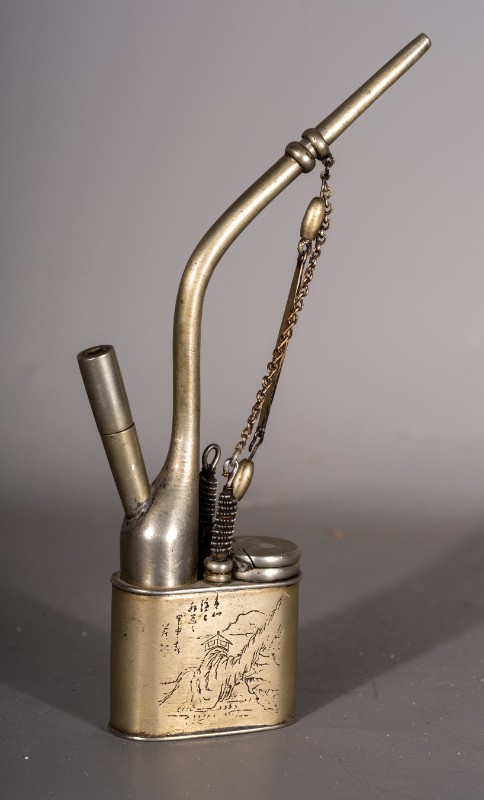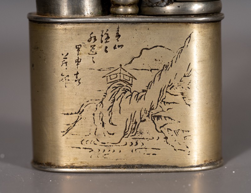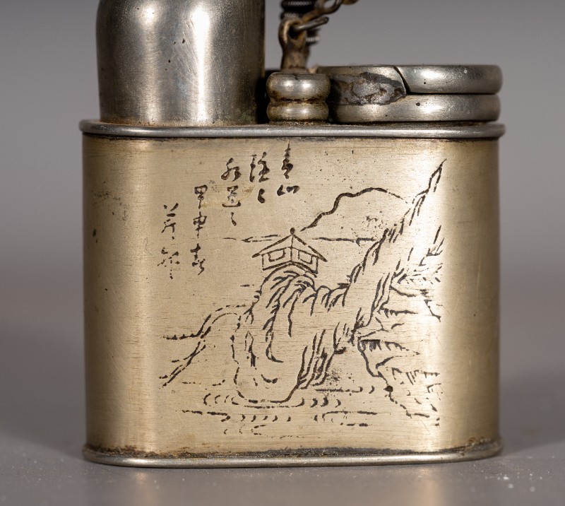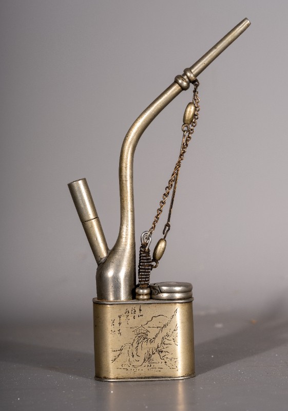 白铜水烟壶,材质为白铜,器型较完整,民间征集,做工精美,壶身刻有行草“青山隐隐水迢迢、山水亭阁”,落款时间甲申春,初步推测为清末。现存于桃力民抗日根据地史实陈列馆。