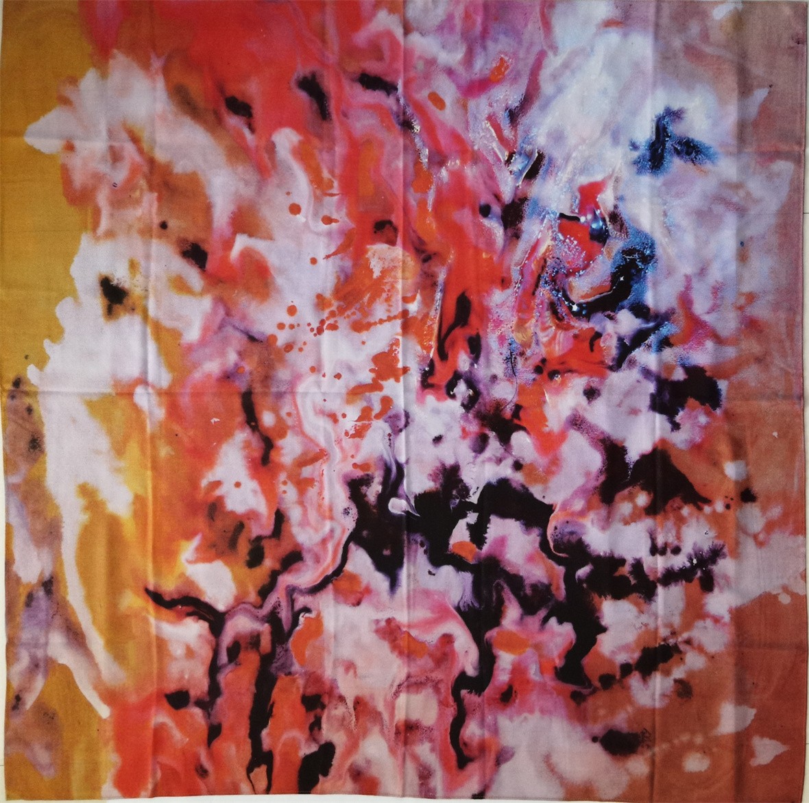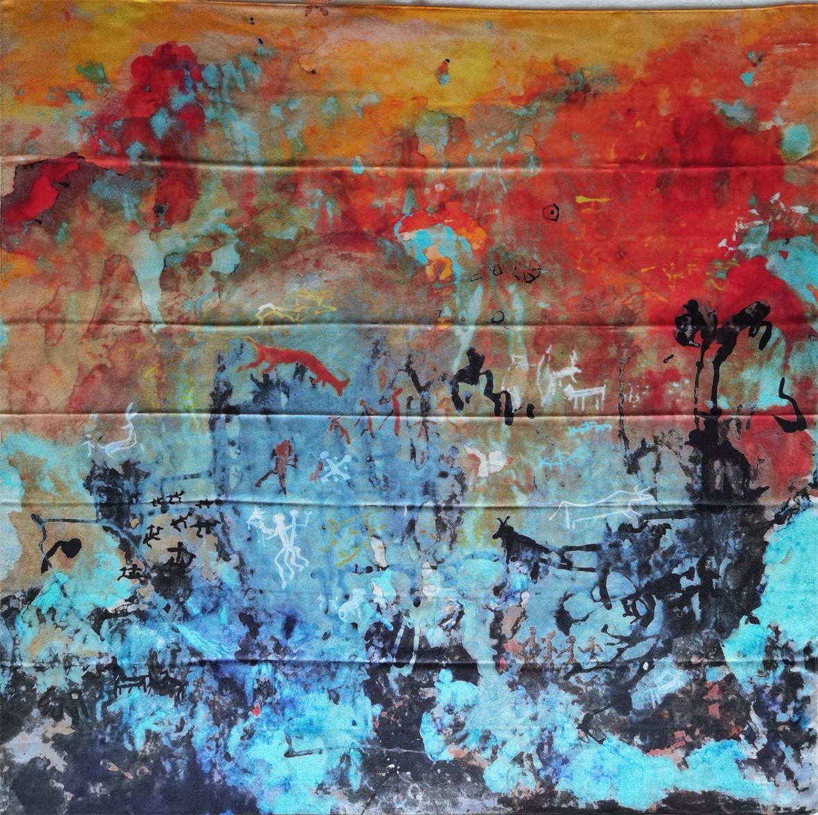 创作思路:画家选取了鄂尔多斯最具代表性的文化标志:汉代车马图、星空、岩画以及黄河几字湾。画面恢弘开阔,色调深沉明快。意象集中多元,感情热烈奔放。画者立足于鄂尔多斯亿万年苍茫的历史文化脉络,将人类文明史、黄河几字湾风云变迁的英雄史,宇宙星云熔铸于画面之中,且以奔放明快的笔法,抒发了画者对鄂尔多斯经济社会快速发展的深情瞩望与美好祝愿。