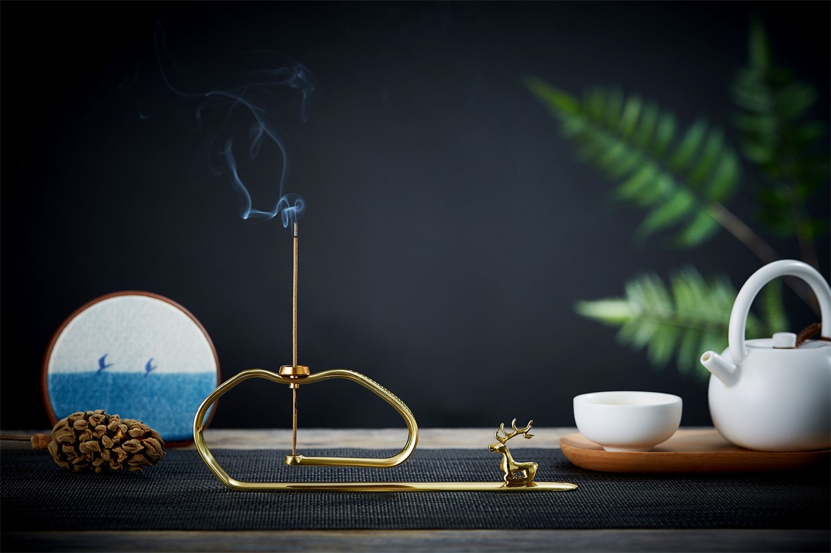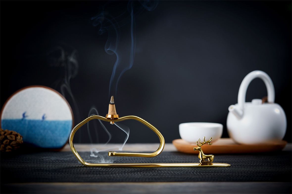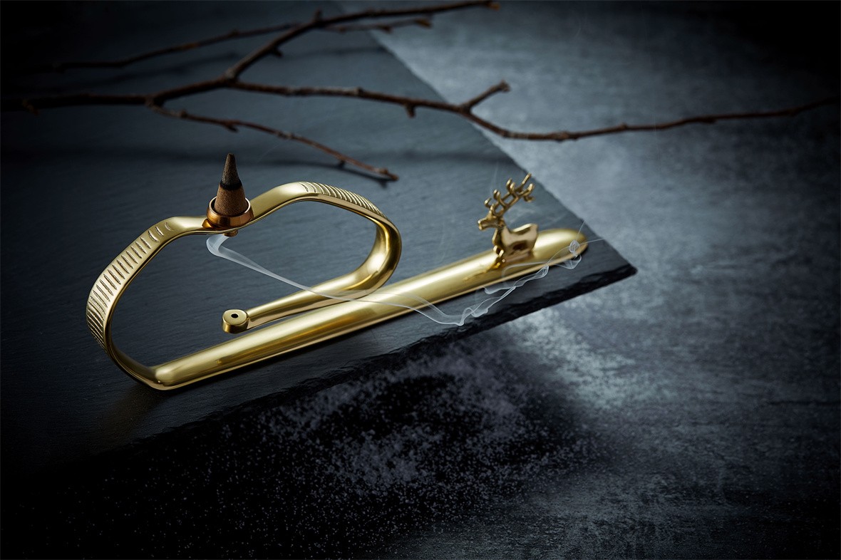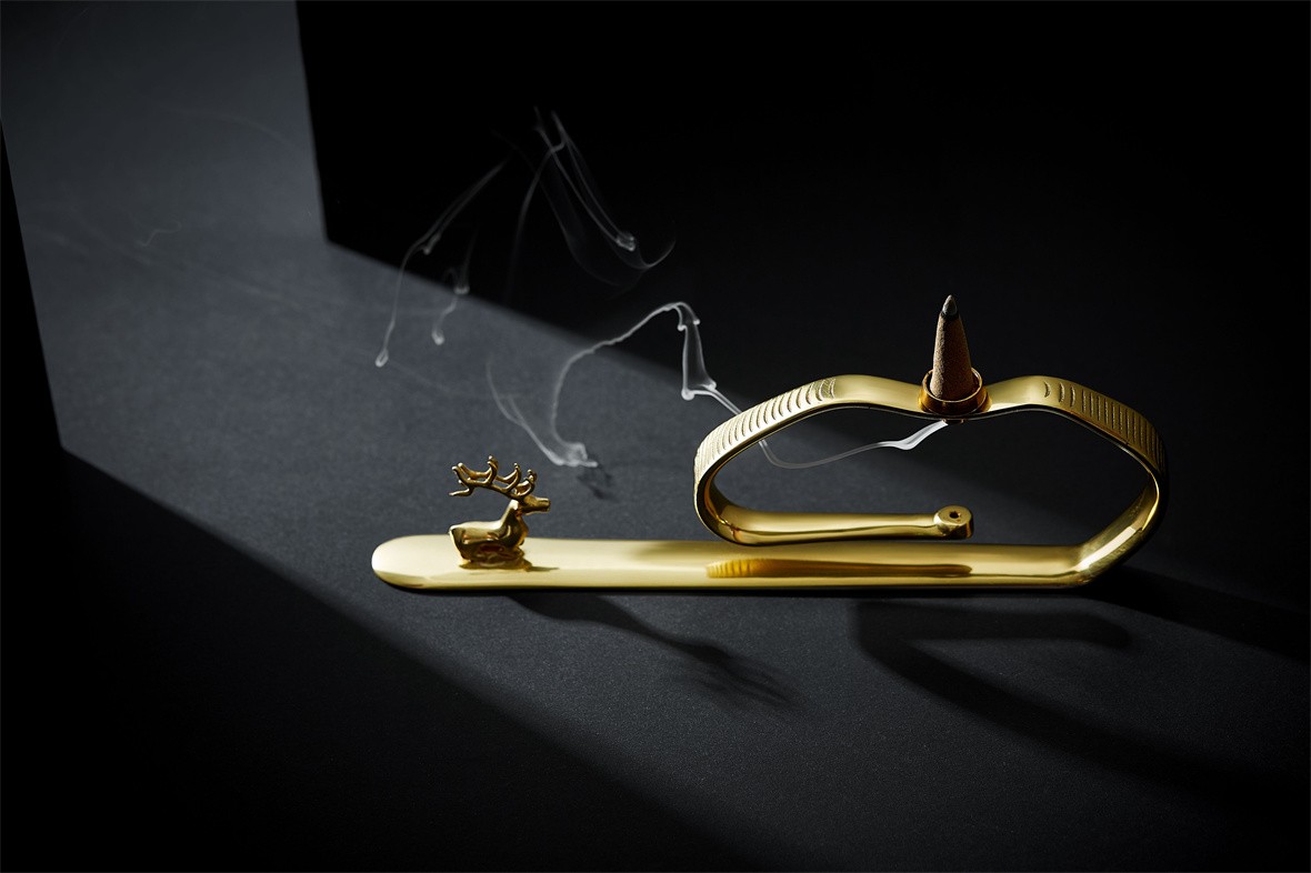 创作思路: 运用鄂尔多斯博物馆的切面形态为香台造型,神似祥云、如意,顿生禅意,材质上采用复古黄铜,素朴内敛,可两用线香及倒流香,配有馆藏青铜卧鹿摆件,彰显文化气质,配套非物质文化遗产草原牛粪香,独具地域特色。 整套包装,内含香台、香托、线香倒流香各一盒及设计说明卡。